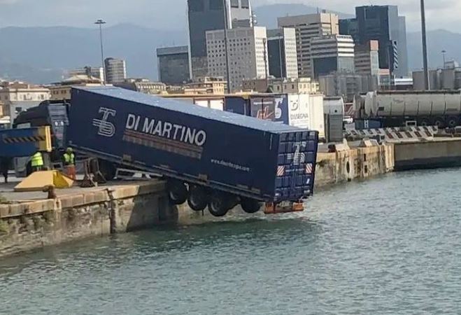 Genova, camion rimane in bilico su un banchina rischiando di cadere in mare