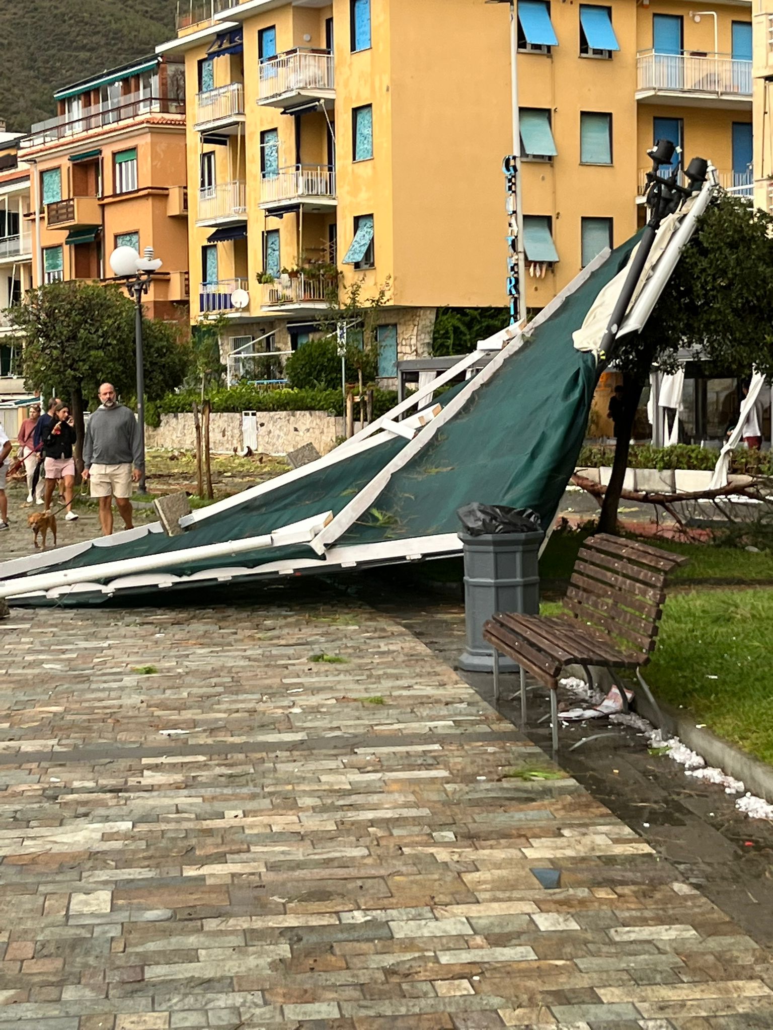 Grandine e tromba d'aria anche a Sestri Levante, con tetti di lamiera, rami e tetti di alcune case rotti o divelti. Diversi danni anche a Cogorno, con molti alberi caduti. I pompieri confermano tanti interventi nel Tigullio. Anche a Paggi, frazione di Carasco, tanti alberi caduti che hanno anche bloccato delle strade provinciali.