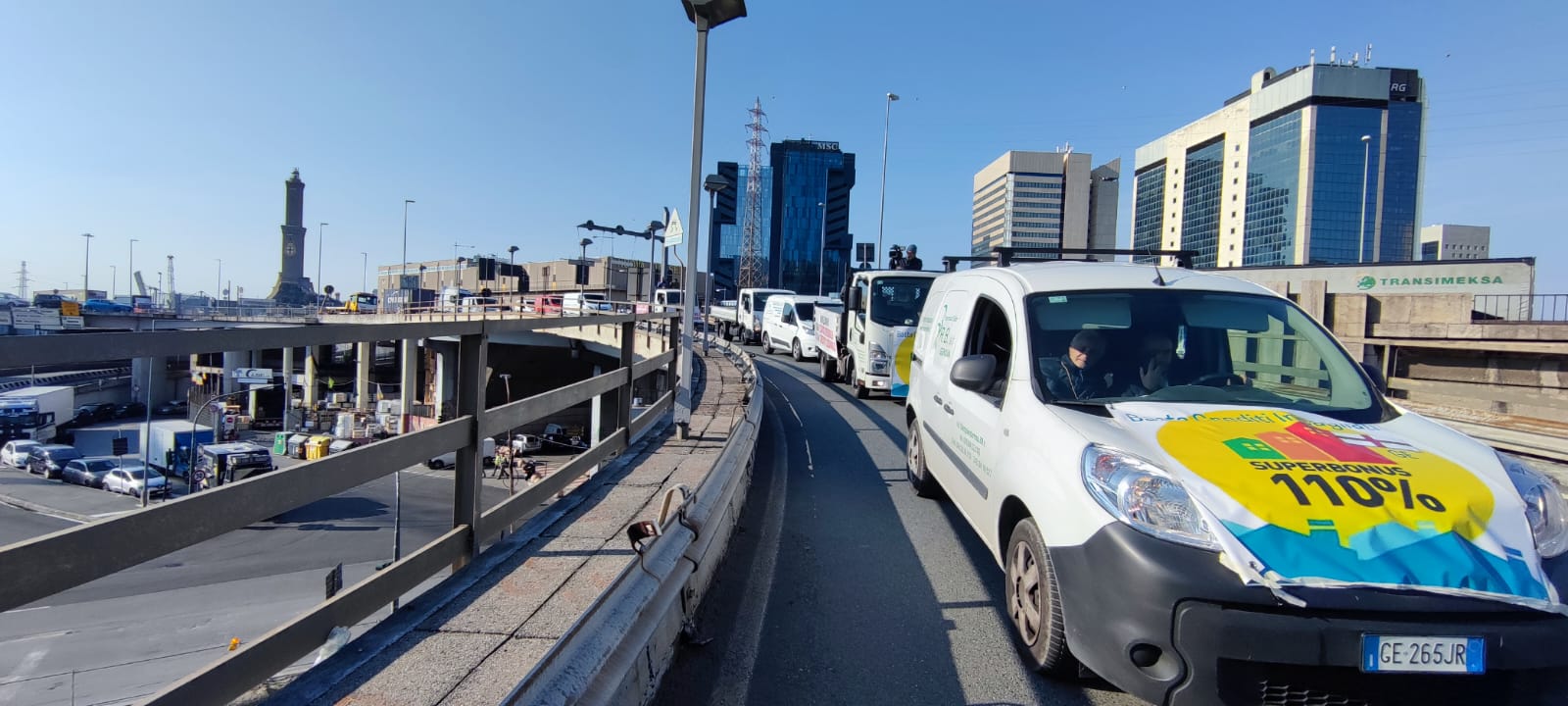 GENOVA - Sono partiti alle 8 due dei tre cortei di mezzi edili che per buona parte della giornata gireranno Genova suonando i clacson per farsi sentire conto il taglio del superbonus 110%. Il terzo, quello che si è dato appuntamento in lungomare Canepa, ha rimandato la partenza fino a poco prima delle 9 a causa dell'entrata e dell'uscita dei mezzi pesanti che necessitavano di entrare in porto.