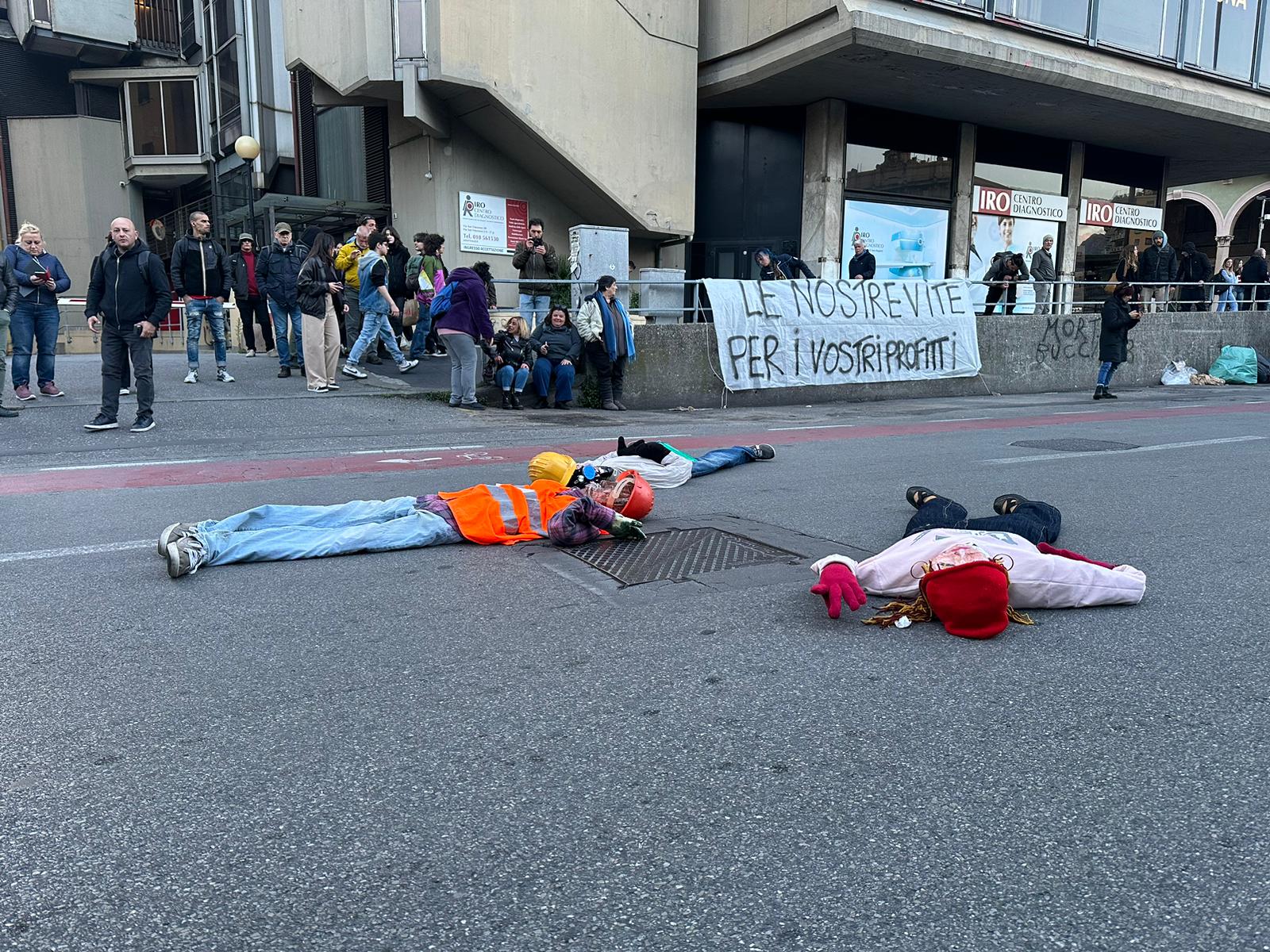 Il corteo è proseguito passando prima davanti alla stazione di Brignole e poi sotto la sede di Confindustria Genova in via Fiume. Qui sono stati posizionati dei manichini simbolo delle morti sul lavoro.