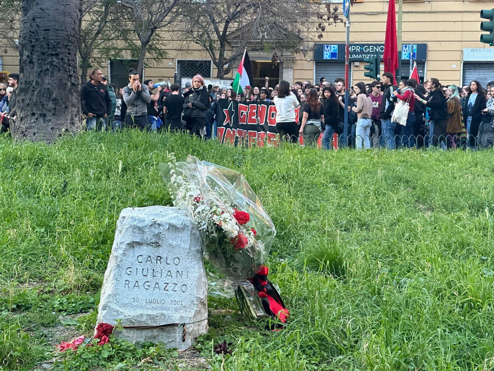 Nel passaggio successivo, in piazza Alimonda, i manifestanti hanno intonato cori per Carlo Giuliani, il giovane manifestante che prese parte alle proteste durante il G8 di Genova e che fu ucciso il 20 luglio proprio lì da un carabiniere che si trovava dentro la camionetta. Posizionato un mazzo di fiori proprio accanto al cippo che ricorda Giuliani. In piazza delle Americhe è stata strappata la bandiera degli Stati Uniti e data in fiamme con un fumogeno.