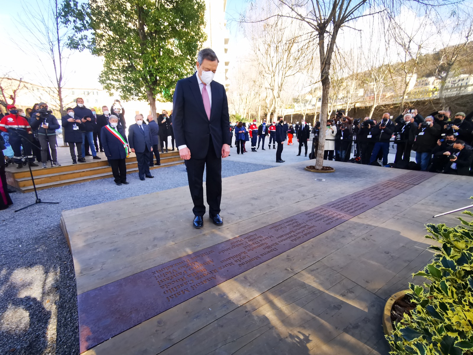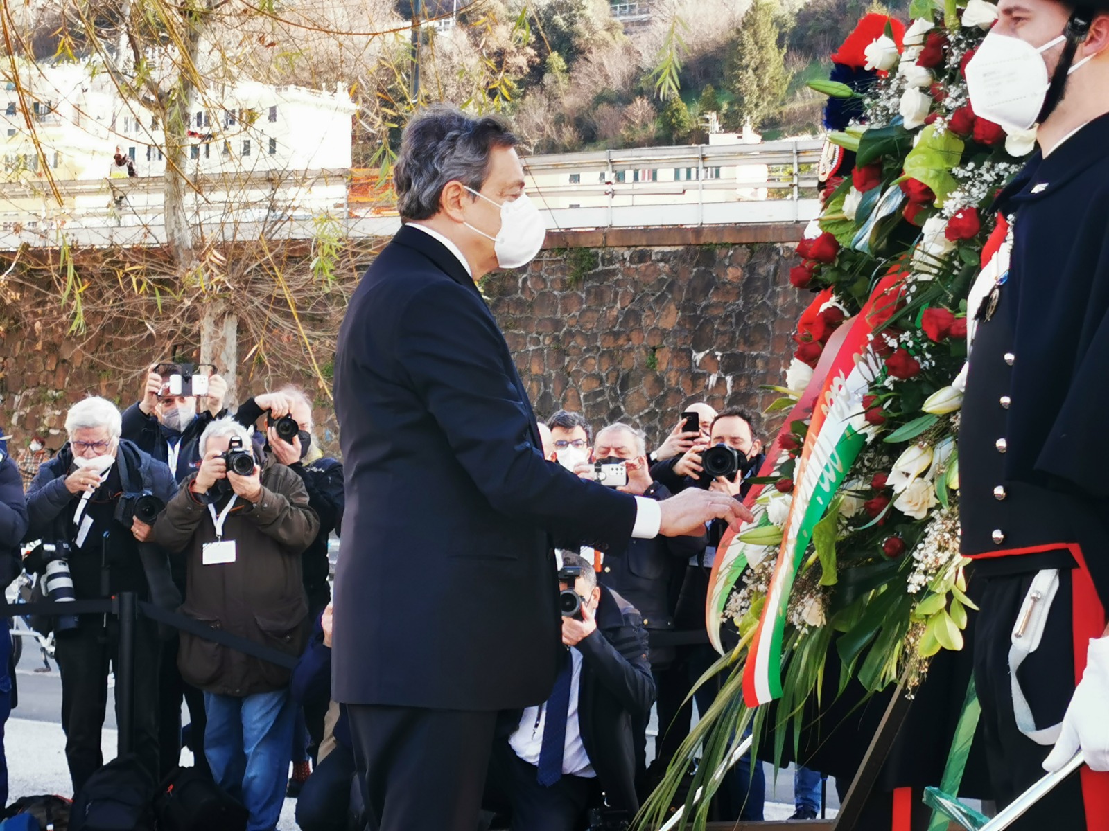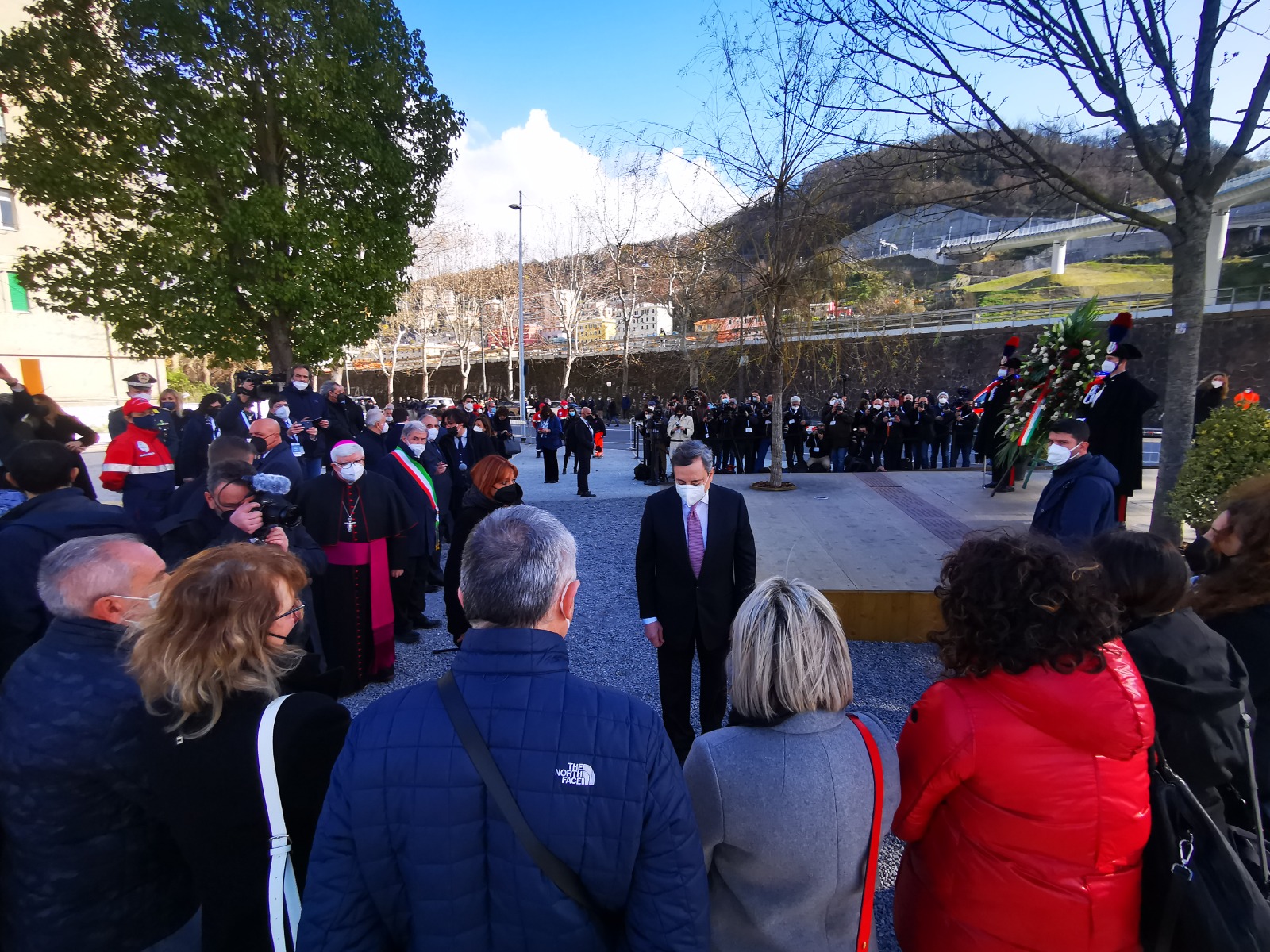 Poi la visita alla Radura della Memoria in via Fillak per incontrare i parenti delle vittime del crollo di ponte Morandi. Un momento di cordoglio e riflessione con Draghi che si è fermato a lungo davanti alla targa che ricorda i nomi delle 43 vittime. "Quattro anni dopo il loro dolore dei familiari è sempre il nostro dolore" ha detto il presidente del Consiglio. I familiari hanno ricordato l'iter del disegno di legge presentato per garantire giustizia piena alle vittime delle tragedie come quelle del ponte Morandi ricevendo rassicurazioni da parte del premier (Guarda qui). Proprio in via Fillak il sindaco Bucci ha consegnato la bandiera con la croce di San Giorgio, simbolo di Genova, nelle mani di Draghi.