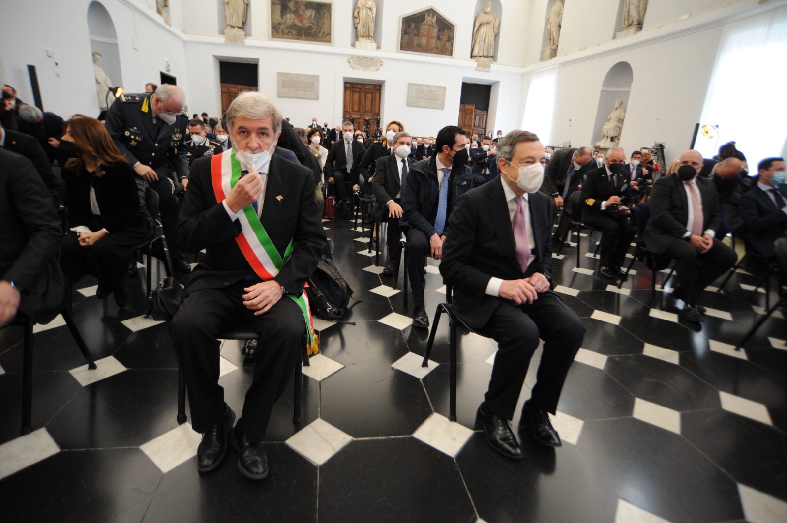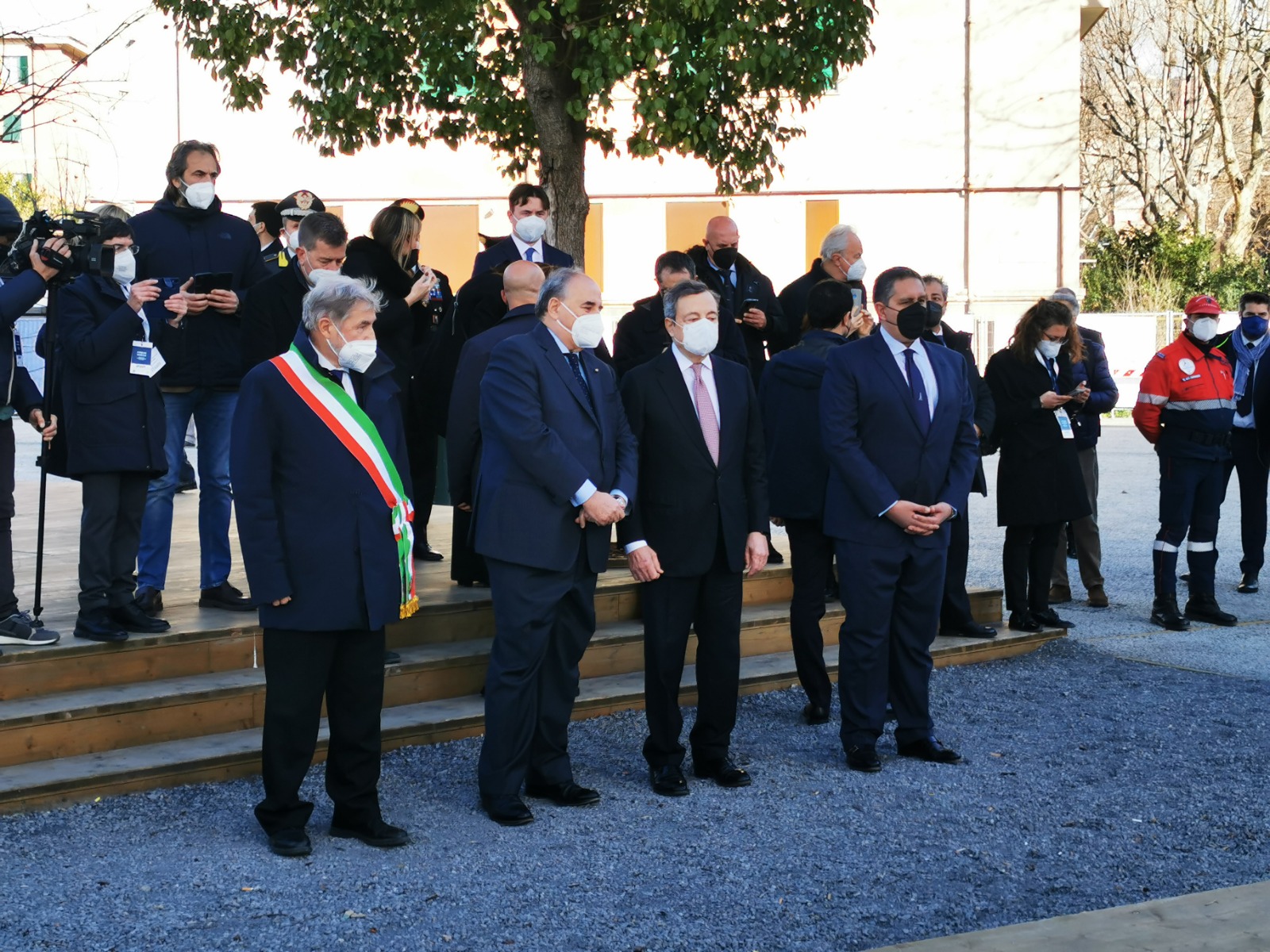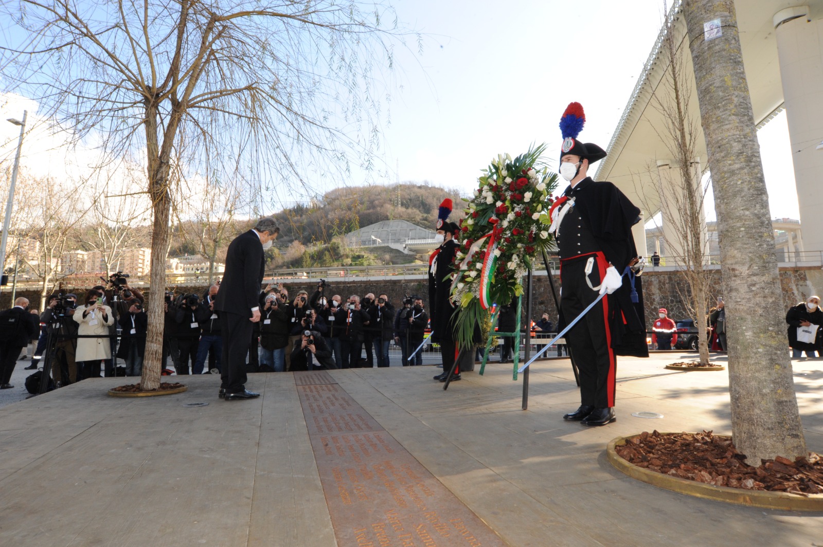 Poi la visita alla Radura della Memoria in via Fillak per incontrare i parenti delle vittime del crollo di ponte Morandi. Un momento di cordoglio e riflessione con Draghi che si è fermato a lungo davanti alla targa che ricorda i nomi delle 43 vittime. "Quattro anni dopo il loro dolore dei familiari è sempre il nostro dolore" ha detto il presidente del Consiglio. I familiari hanno ricordato l'iter del disegno di legge presentato per garantire giustizia piena alle vittime delle tragedie come quelle del ponte Morandi ricevendo rassicurazioni da parte del premier (Guarda qui). Proprio in via Fillak il sindaco Bucci ha consegnato la bandiera con la croce di San Giorgio, simbolo di Genova, nelle mani di Draghi.