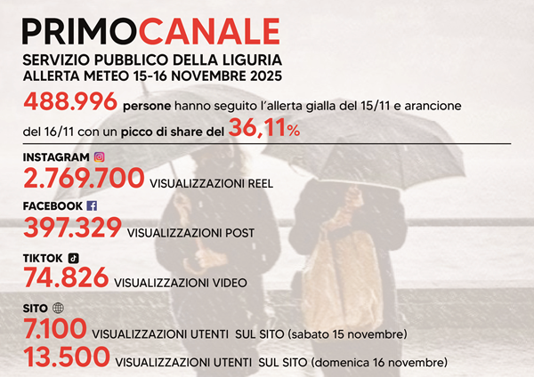 Quasi mezzo milione di persone – 488.996 – hanno seguito l’evoluzione dell’allerta meteo nel corso del weekend, con un picco di share del 36,11%, dato che indica che oltre un terzo dei telespettatori liguri con la tv accesa era sintonizzato su Primocanale nei momenti più critici.