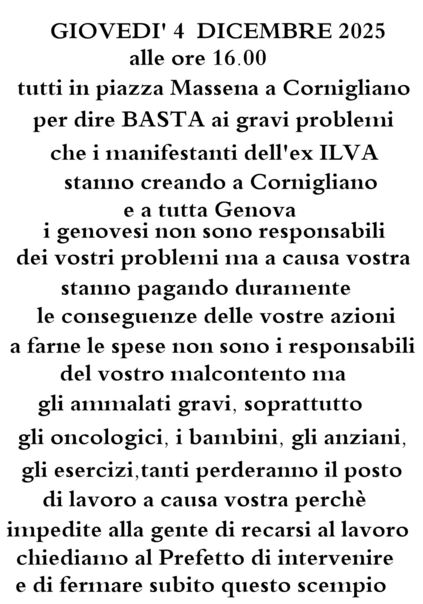 L'appuntamento è per giovedì 4 dicembre alle ore 16 in piazza Massena "per dire BASTA ai gravi problemi che i manifestanti dell'ex ILVA stanno creando a Cornigliano e a tutta Genova. I genovesi non sono responsabili dei vostri problemi ma a causa vostra stanno pagando duramente le conseguenze delle vostre azioni. A farne le spese non sono i responsabili del vostro malcontento ma gli ammalati gravi, soprattutto gli oncologici, i bambini, gli anziani, gli esercizi, tanti perderanno il posto di lavoro a causa vostra perché impedite alla gente di recarsi al lavoro. Chiediamo al Prefetto di intervenire e di fermare subito questo scempio"