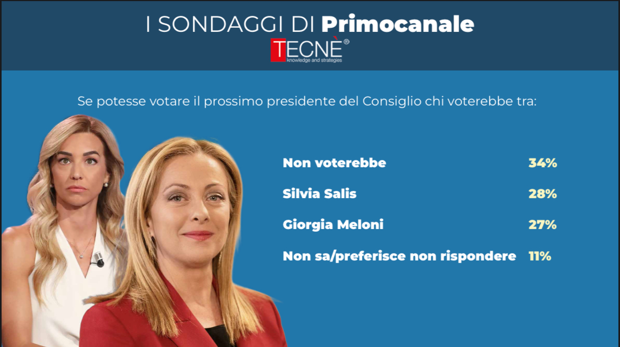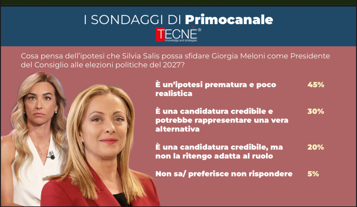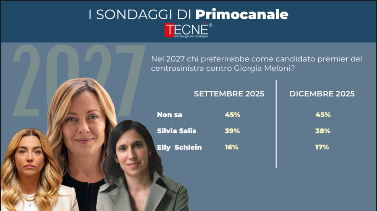 Interviste effettuate tra il 22 e il 23 dicembre 2025 con metodo cati - cawi. Totale contatti: 7.232 (100,0%); rispondenti 1.001 (13,8%) - rifiuti e sostituzioni: 6.231 (86,2%). Margine di errore: + -3,1% Soggetto che ha realizzato il sondaggio: Tecnè srl - Committente: P.T.V. Programmazioni Televisive S.p.A. - II documento relativo al sondaggio sul sito: sondaggipoliticoelettorali.it o agcom.it