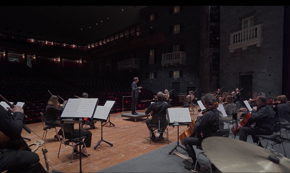 Alla piazza di Primocanale l'orchestra del Carlo Felice, diretta dal maestro Marcello Rota, che esegue la musice della colonna sonora di Amarcord