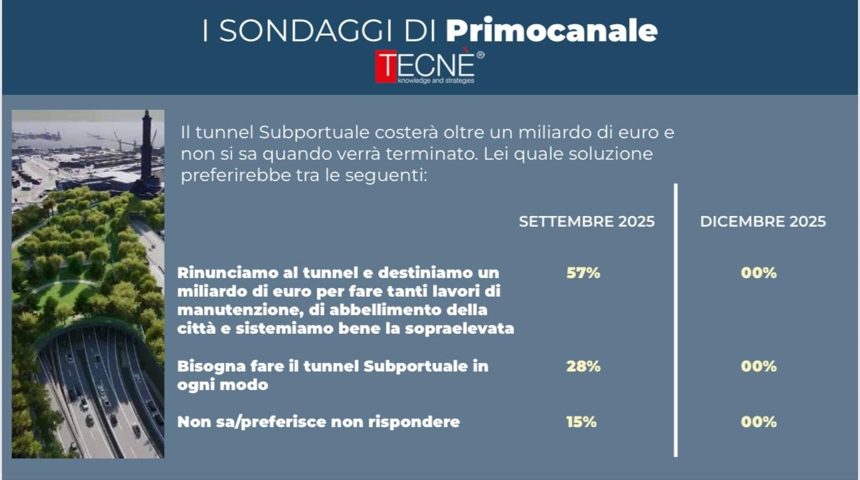 I genovesi sono stati inoltre chiamati a esprimersi sulla percezione della città: Genova è oggi più pulita o più sporca rispetto al passato? E sul fronte delle grandi opere, qual è il giudizio sul tunnel subportuale: un’infrastruttura necessaria o un progetto da rivedere?