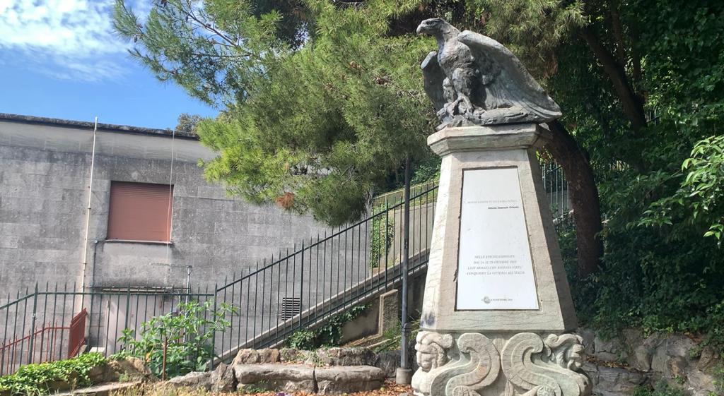 In mezzo alla camminata in mezzo al giardino ecco spuntare il monumento a obelisco che ha sulla cima una scultura in bronzo raffigurante un'aquila con le ali aperte che poggia su una corona di alloro. L'Aquila è montata alla sommità di un basamento decorato in pietra calcarea del Monte Grappa, qui si trova la targa che ricorda la Medaglia d'oro al valore militare ricevuta dalla città di Genova. Foglie secche, erbacce e una sensazione di desolazione fanno da contorno. Poco distante ecco spuntare un topo saltare da un'aiuola all'altra.