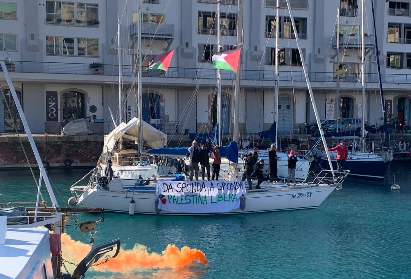 Diverse imbarcazioni che sventolano la bandiera della Palestina sono partite dalla Darsena per seguire il corteo via terra.