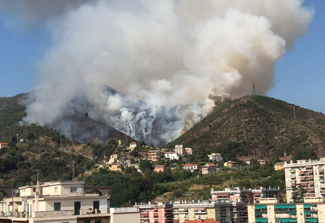 GENOVA - Si stagliano alte le fiamme dell'incendio nato nel primo pomeriggio sulla strada che attraversando il crinale tra Sestri Ponente e Borzoli arriva alla discarica di Scarpino. Da un primo rogo l'incendio si è allargato fino ad arrivare alla cresta del monte Teiolo, coprendo buona parte della vegetazione del versante che si affaccia sul quartiere genovese e rendendo la situazione critica.