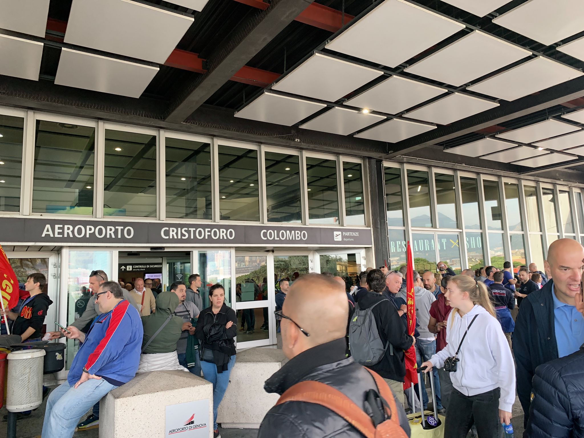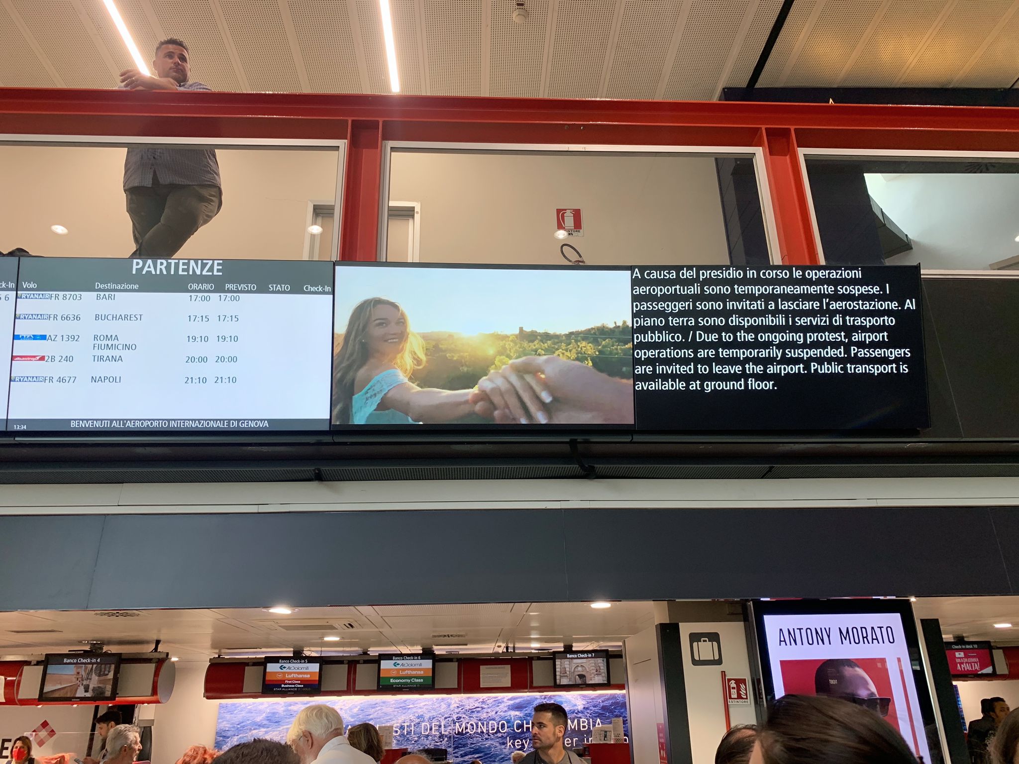 Dopo l'occupazione da parte dei lavoratori di Ansaldo l'Aeroporto di Genova ha comunica che "i voli in arrivo saranno dirottati su altri scali" e l'invito "ai passeggeri in partenza di non recarsi in aeroporto. Al momento le operazioni sono sospese". I passeggeri che si sarebbero dovuti imbarcare per Catania, Monaco, Barcellona, Amsterdam, Napoli, ma anche per Roma, Palermo, Bari, Bucarest e Tirana sono stati invitati a scendere dall'aereo, a lasciare la struttura e a contattare le compagnie. Risultano già dirottati su altri aeroporti i voli provenienti da Monaco, Barcellona, ma anche Parigi, Roma e Palermo. Cancellati, invece, i voli di Ita Airways delle 19:10 per Roma, come quelli per Palermo, Bari e Bucarest delle 16:30, 17:00 e 17:15.
