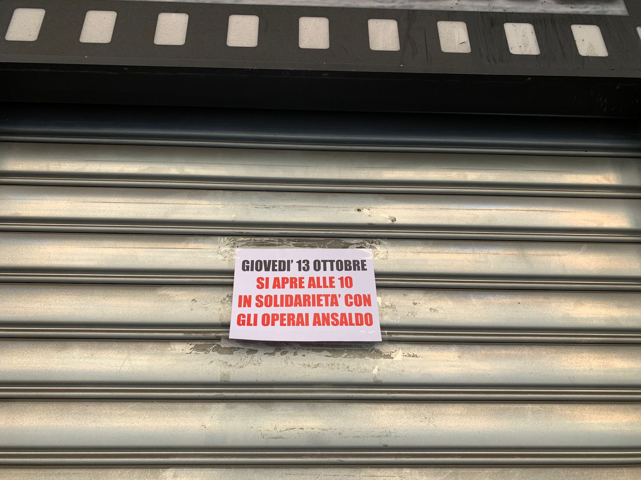 Lungo la strada di primo mattino alcune serrande tirate giù per solidarietà ai lavoratori: "Si apre alle 10 in vicinanza ai lavoratori Ansaldo", si legge sui cartelli apposti sulle saracinesche.