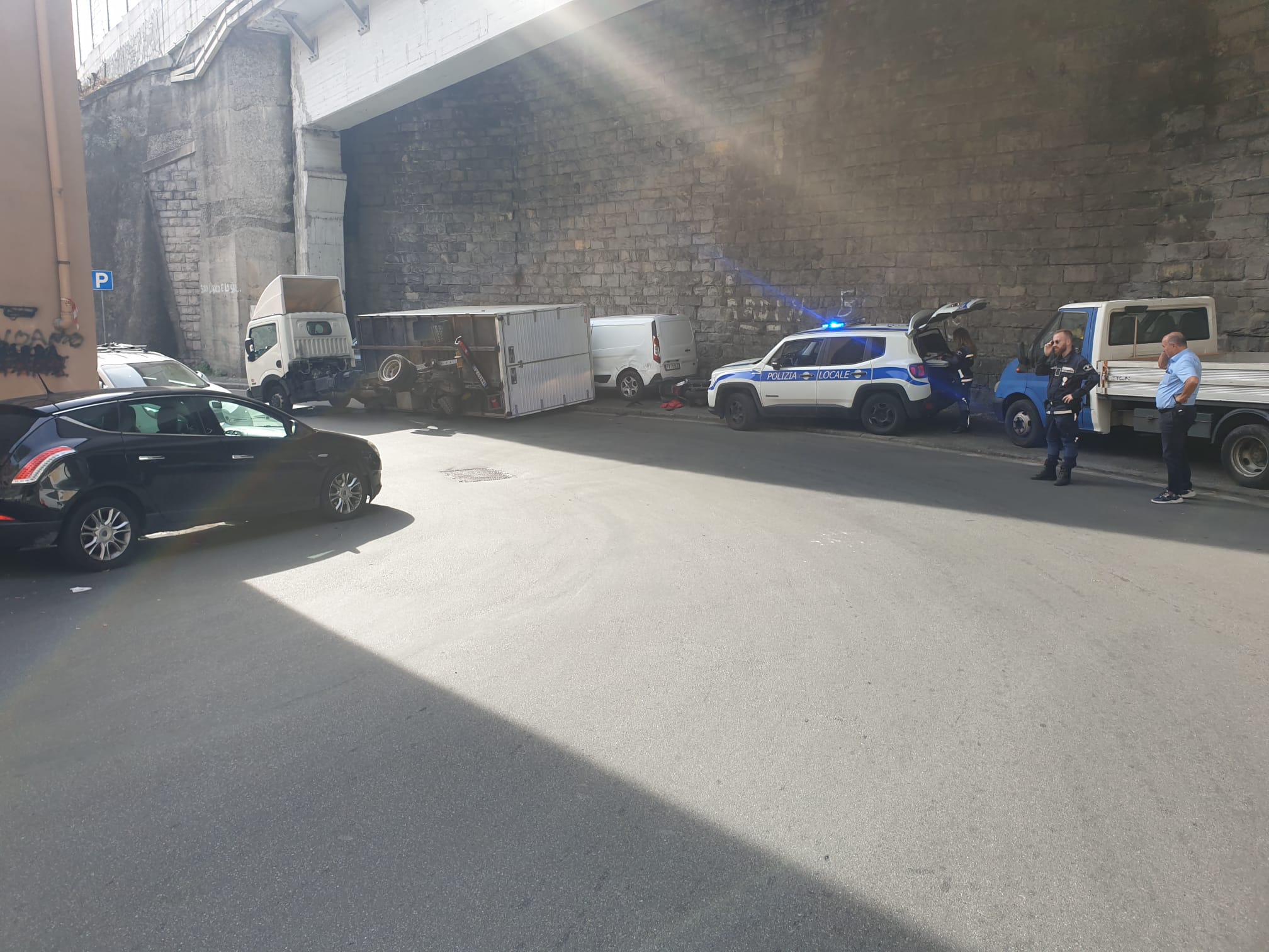 GENOVA - Alcuni danni, ma fortunatamente nessun ferito per un rimorchio che si è ribaltato all'ora di pranzo a Genova, in via del Fossato. Il fatto è accaduto alle 13:25 e sul posto sono intervenute tre auto della polizia locale.