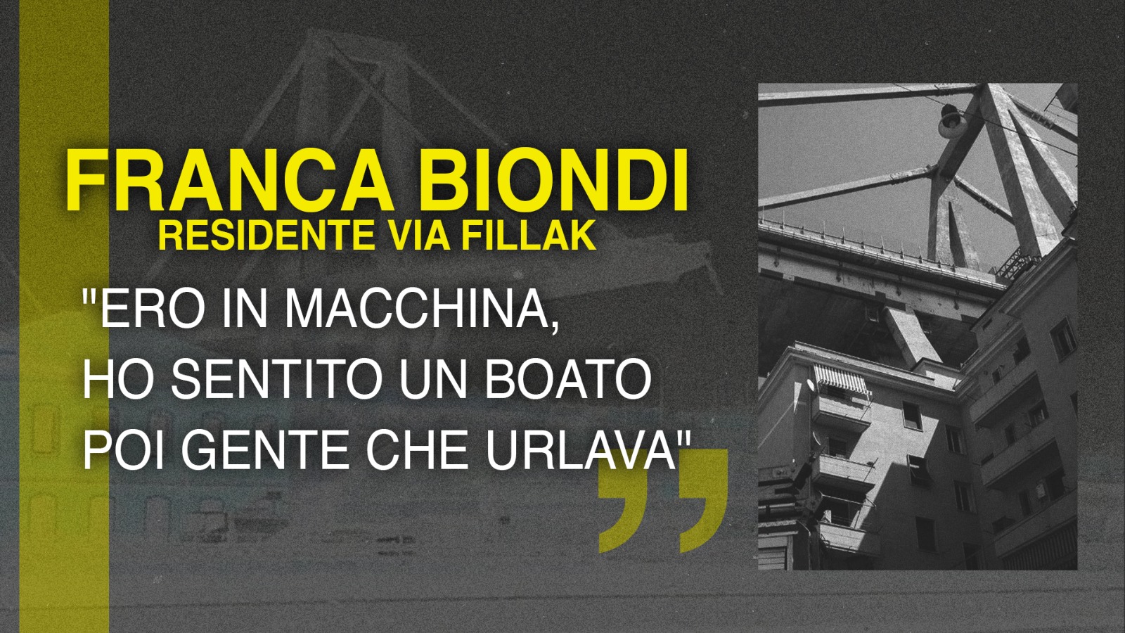 Sono le parole di Franca Biondi, residente di via Fillak, la prima teste sentita dai giudici nel primo giorno dell'istruttoria nel corso del processo per il crollo di ponte Morandi avvenuto il 14 agosto 2018 che causò la morte di 43 persone e che vede alla sbarra 58 imputati fra cui i vertici di Autostrade per l'Italia e di Spea e funzionari del ministero delle Infrastrutture (Leggi qui).