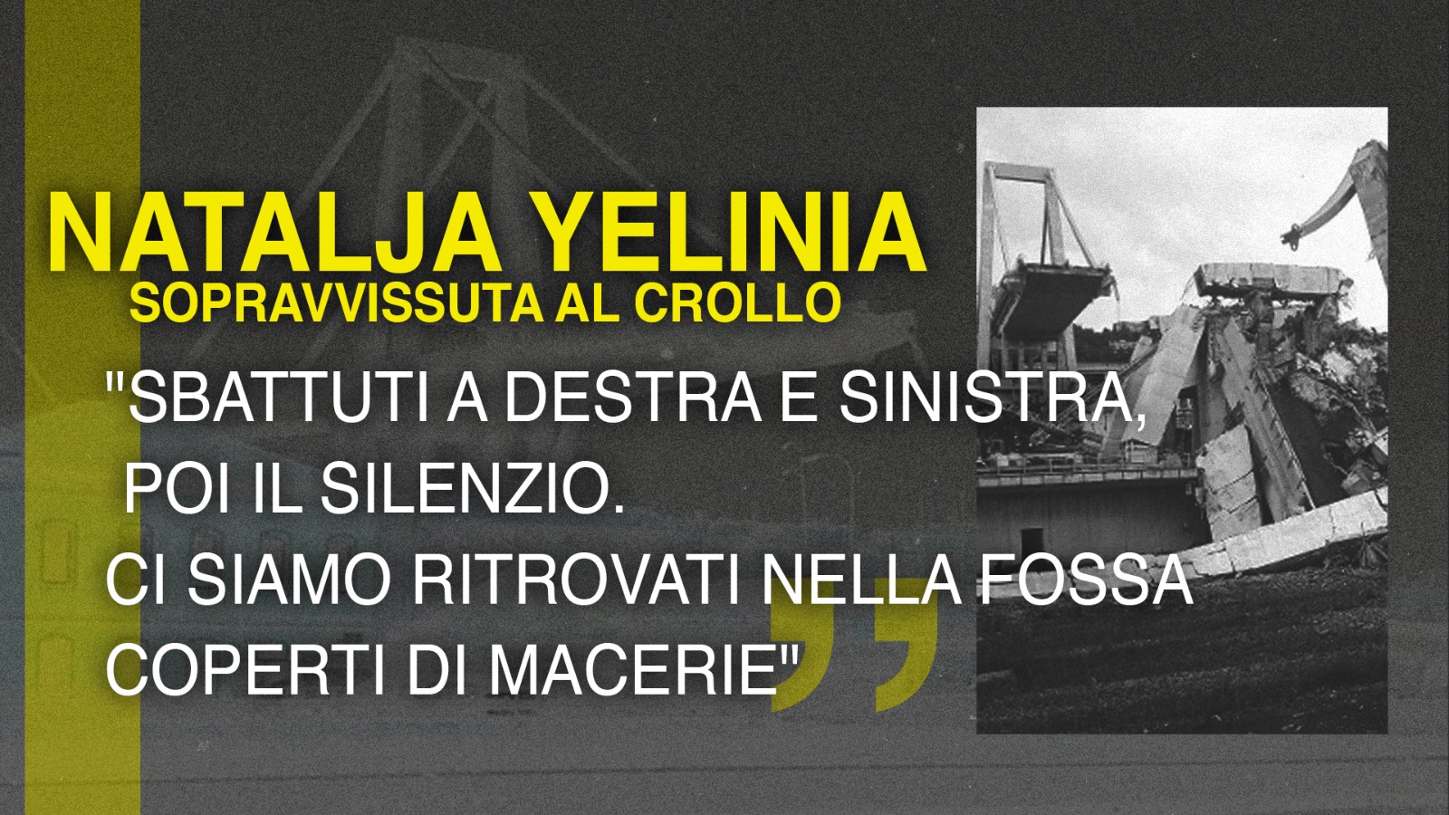 Subito dopo è la volta della moglie Natalja Yelinia: "Stavamo andando in Francia, la macchina ha iniziato ad alzarsi, sembrava di essere su un ponte mobile, come essere in salita. Avremmo voluto scendere dalla macchina (...) Pioveva fortissimo, non ci rendevamo conto di essere sul ponte. Poi il vuoto (...) Mio marito ha visto che un pezzo del ponte era caduto Siamo caduti (...), poi non si capiva, siamo stati sbattuti a destra e sinistra, poi il silenzio e ci siamo ritrovati in quella fossa coperti dalle macerie.(Leggi qui).