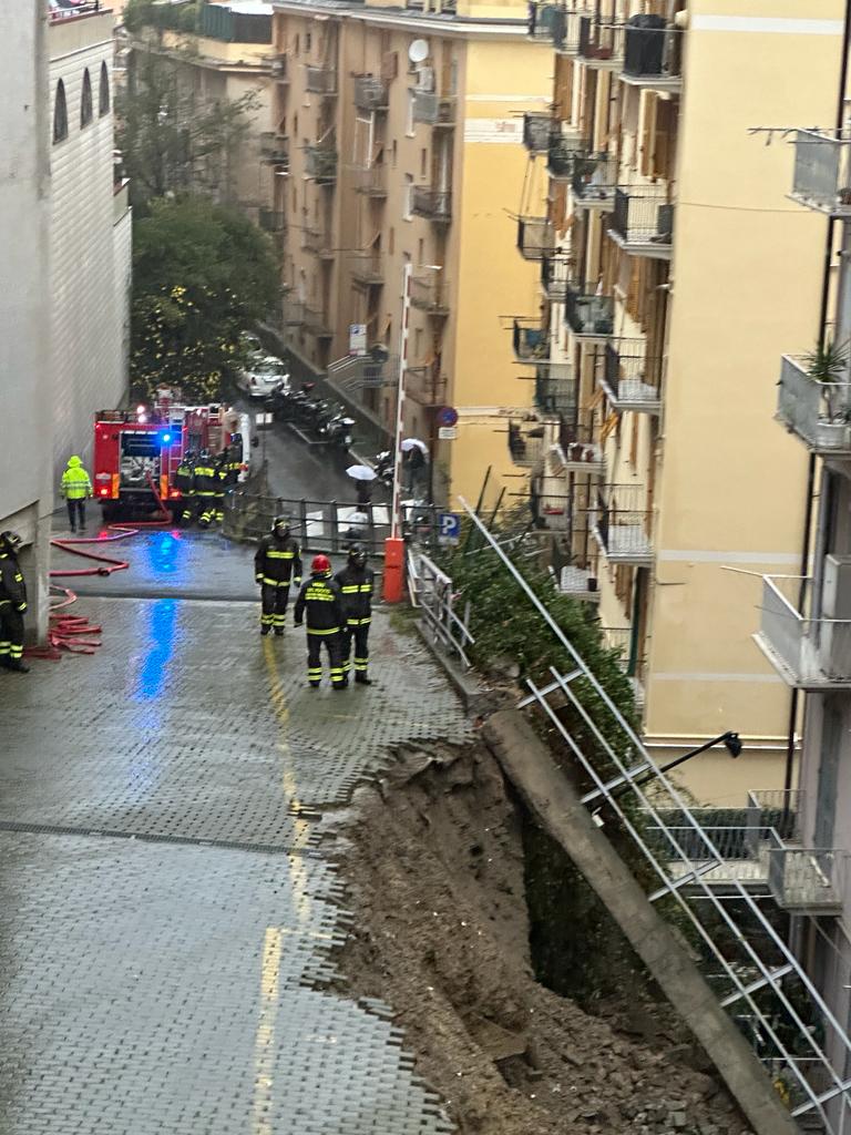 Il crollo è avvenuto alle 15 in via Cabrini, la strada soprastante via Acquarone. Ancora non è chiara la causa dello smottamento anche se il primo collegamento è con il maltempo dell'ultimo periodo.
