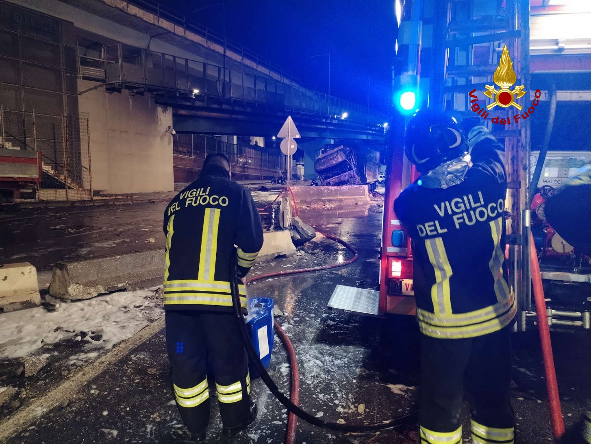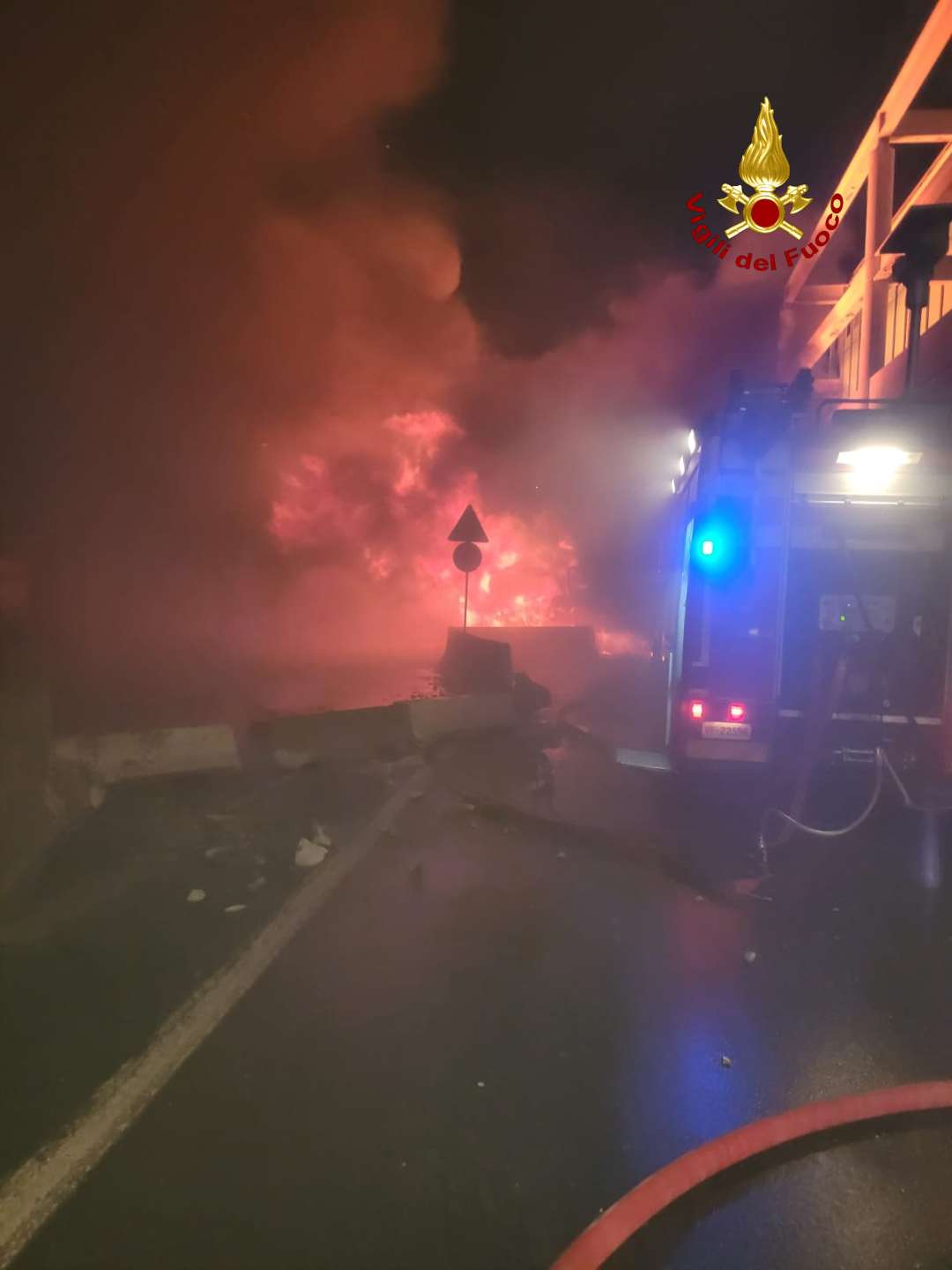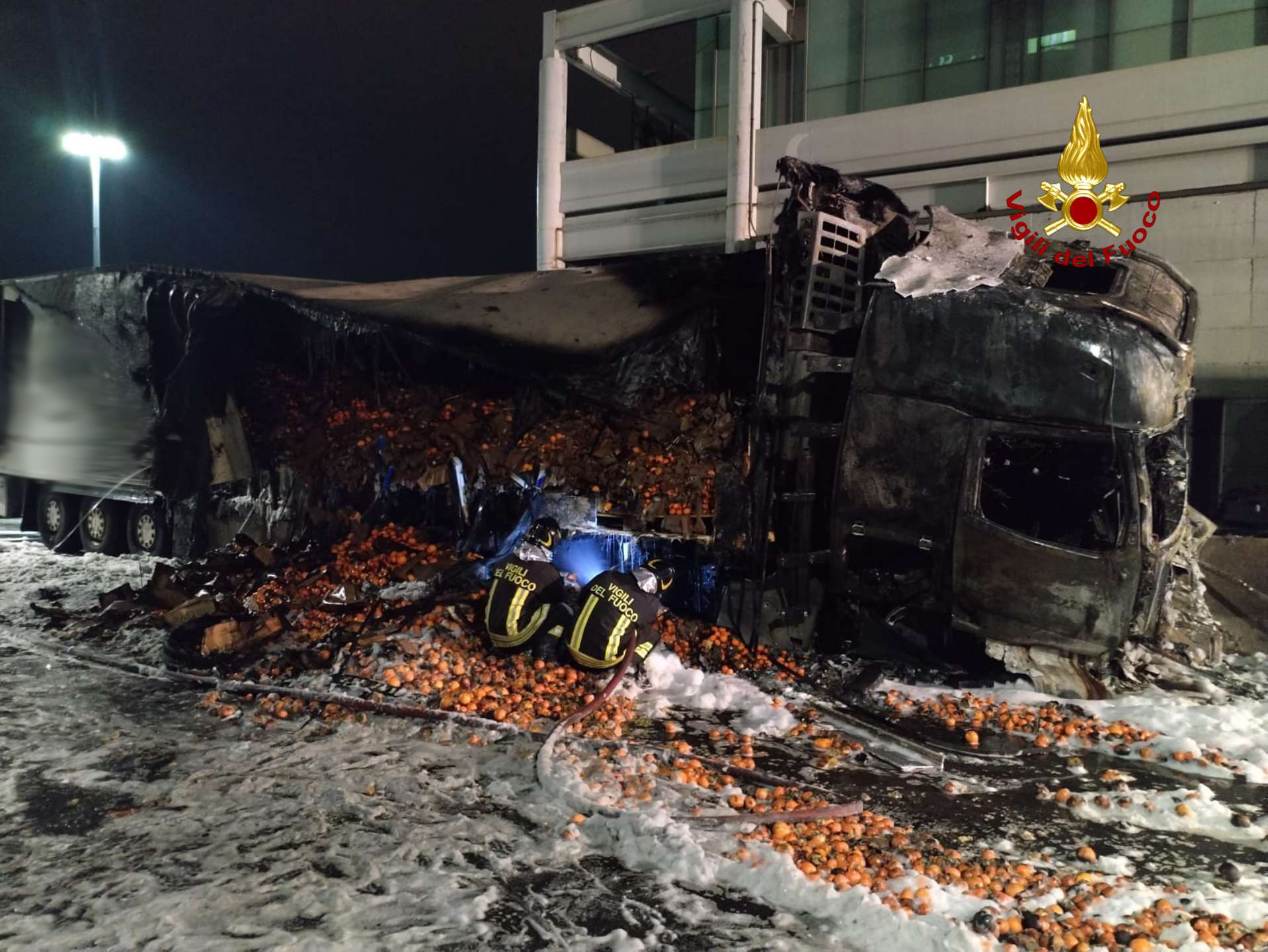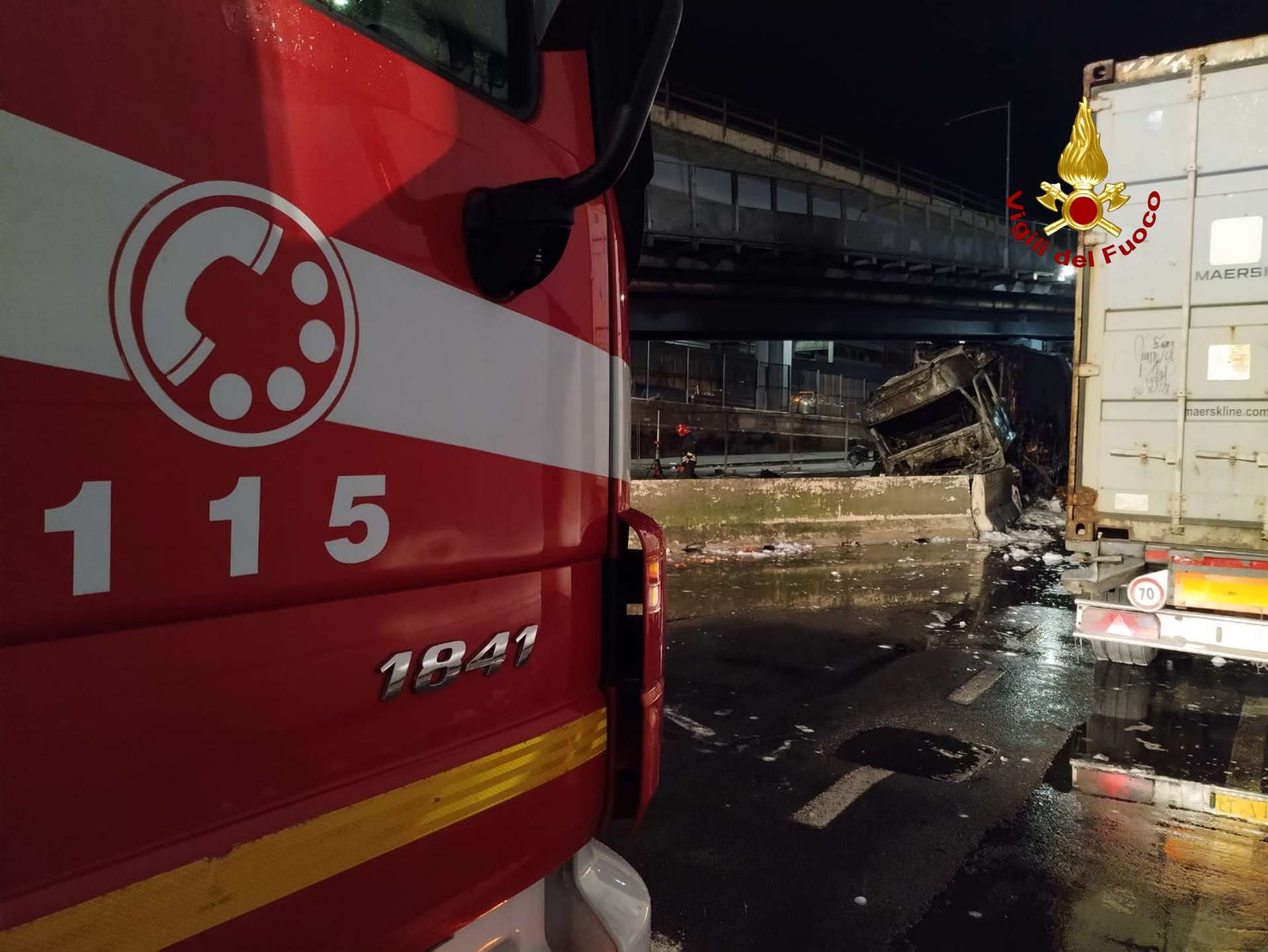 Da una prima ricostruzione sembra che un camion carico di casse di arance diretto all'uscita di varco Albertazzi abbia urtato dei masselli che dividono le carreggiate: l'impatto ha squarciato il serbatoio di gasolio che sversandosi, ha trovato l'innesco ed ha generato l'incendio anche del mezzo pesante. I vigili del fuoco sono giunti sul posto e hanno attaccato l'incendio con lo schiumogeno, nel frattempo hanno protetto dal calore un altro camion in sosta limitando i danni.