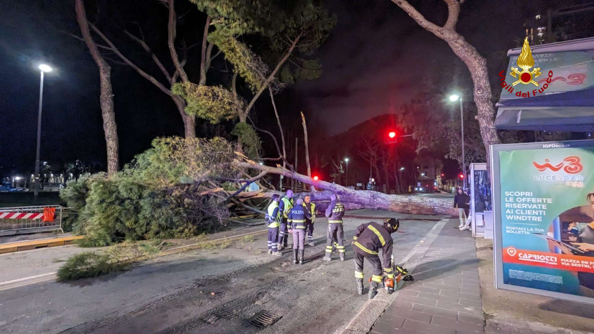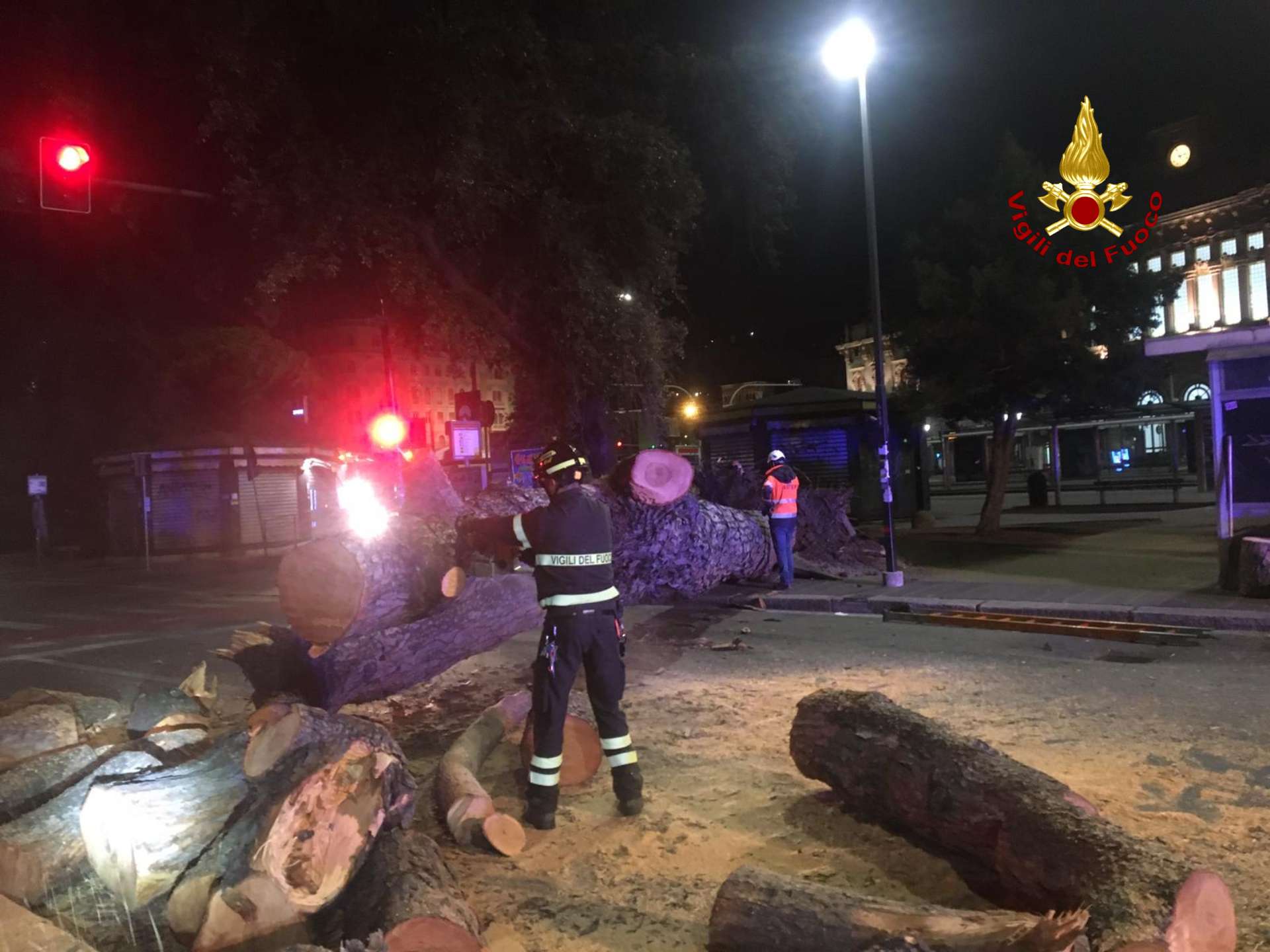 GENOVA - Notte di lavoro per vigili del fuoco e polizia locale dopo che un grosso albero, un leccio secolare, è caduto davanti alla stazione ferroviaria di Brignole.