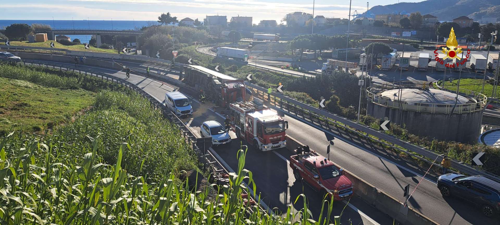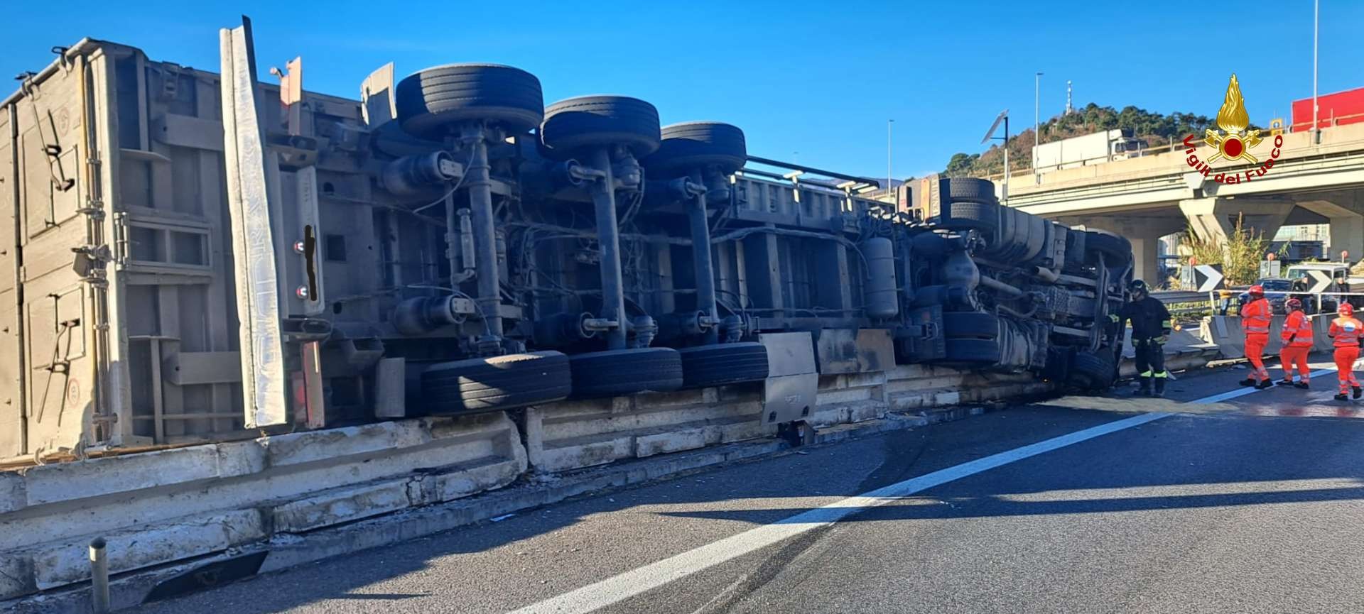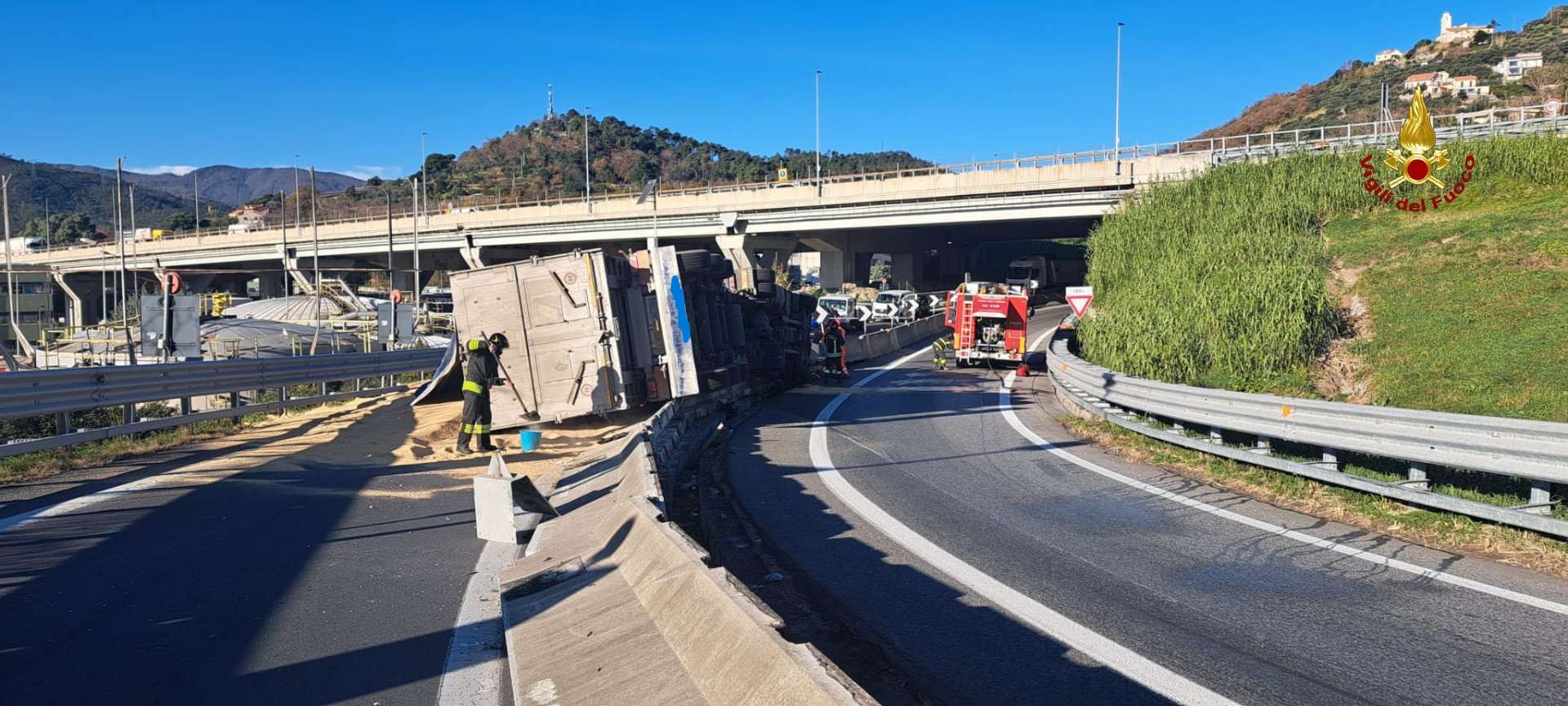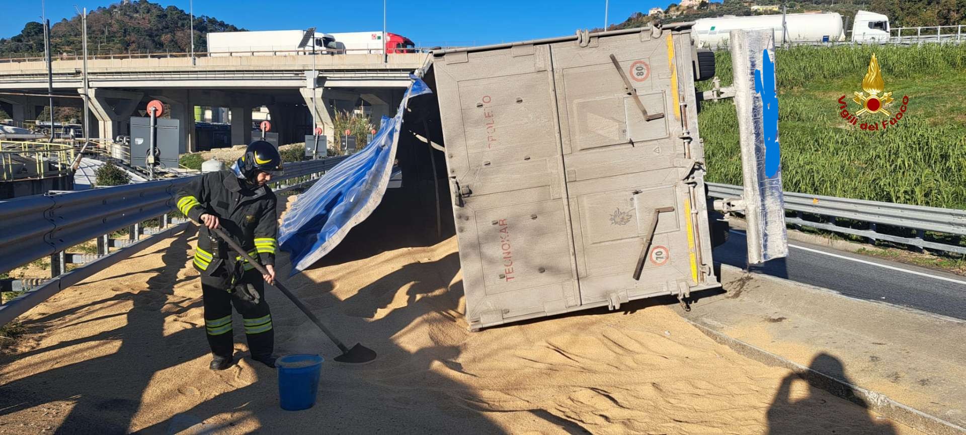 Disagi e code sull'Autostrada del Fiori A10 nel raccordo in direzione di Torino per un camion pieno di soia che si è ribaltato nell'effettuare una curva. Il carico è rovinato sull'asfalto provocato il blocco dello svincolo.
