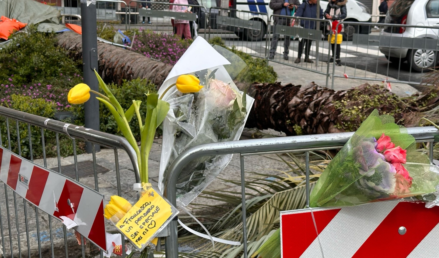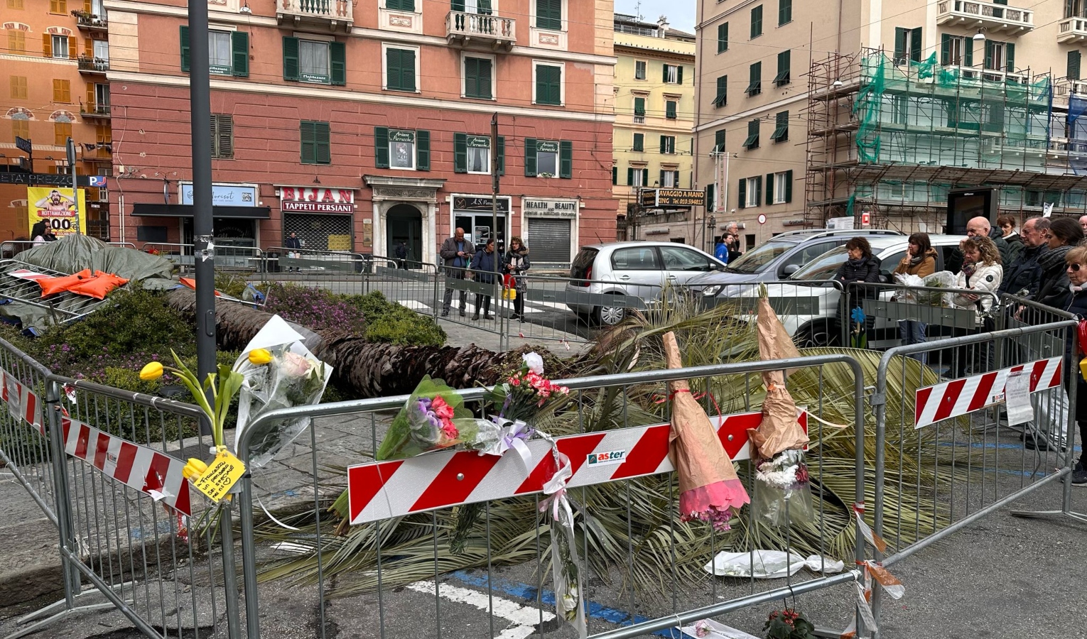 Fiori e biglietti sul luogo della tragediaGenova si stringe intorno a Francesca Testino, la funzionaria regionale di 57 anni schiacciata e uccisa da una palma crollata all'improvviso in piazza Paolo da Novi alla Foce.