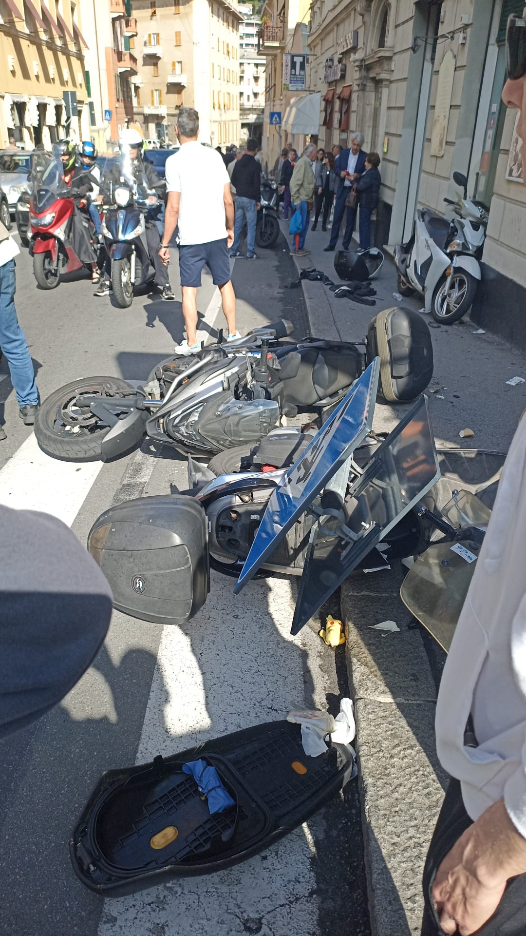 Erano da poco passate le nove di mattina a Nervi: nell'arteria del centro del quartiere, proprio davanti al bar gelateria Chicco, l'uomo alla guida dell'auto ha travolto i motocicli parcheggiati. Tre in tutto, proprio davanti al locale: in quel momento era appena uscita dal bar una ragazza, in mano un caffè da asporto. Travolta dall'auto, la 28enne ha escoriazioni e traumi ed è stata soccorsa dalla Croce Verde di Bogliasco e poi portata al pronto soccorso dell'ospedale San Martino in codice giallo. A salvarla da traumi maggiori è stato l'impatto dell'auto contro le moto. Sul muro di via Oberdan, come racconta a Primocanale Massimiliano Spigno, titolare di Chicco, ancora le macchie del caffè volato verso l'alto.