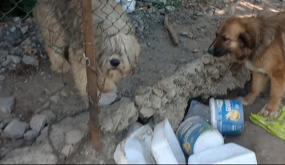 E però in questo tempo non ha potuto garantirgli condizioni di benessere: erano legati a un metro di catena spesso attorcigliata, senza cucce e ripari esposti quindi agli eventi climatici estremi, vivevano nello sporco tra piattini di plastica e altri rifiuti quindi privi di rifornimento costante d’acqua.