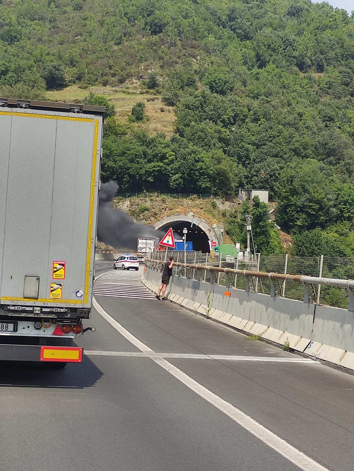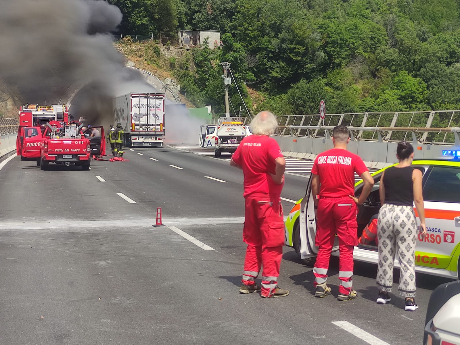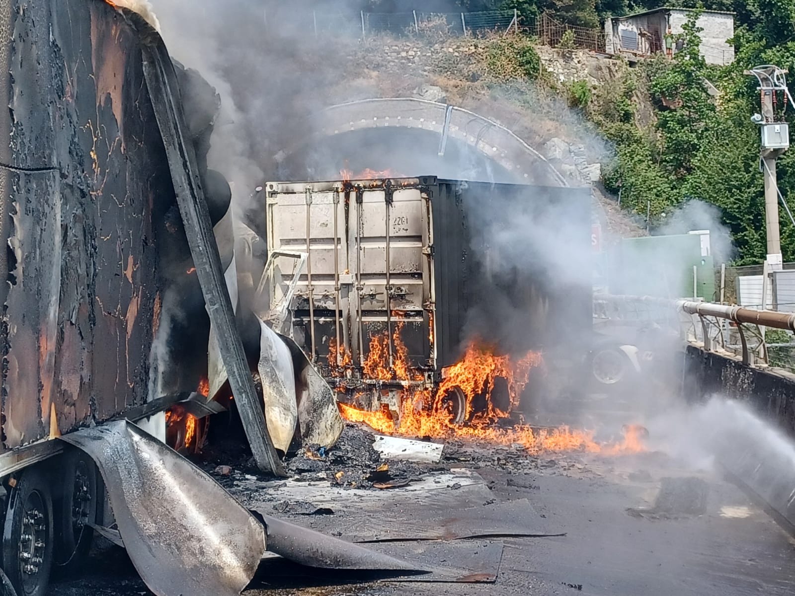 ORE 19:49 - La riapertura di una corsia bypass nel tratto sull'A26 è stata rimandata fino allo spegnimento delle fiamme che stanno interessando il bosco sotto il viadotto, causate dall'incendio dei due camion.