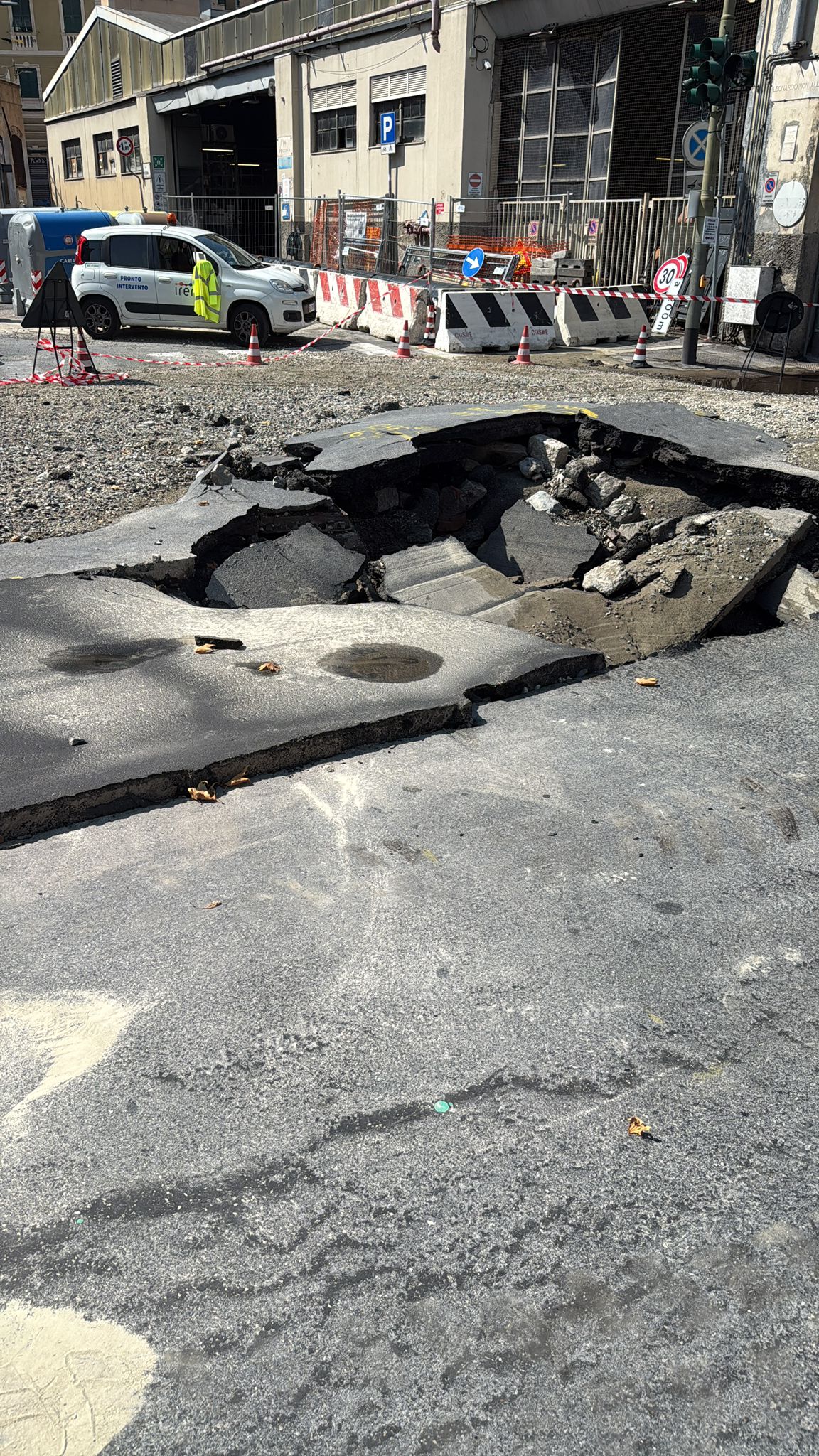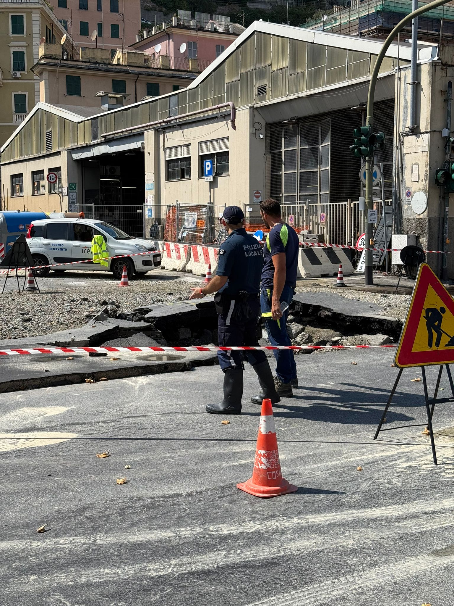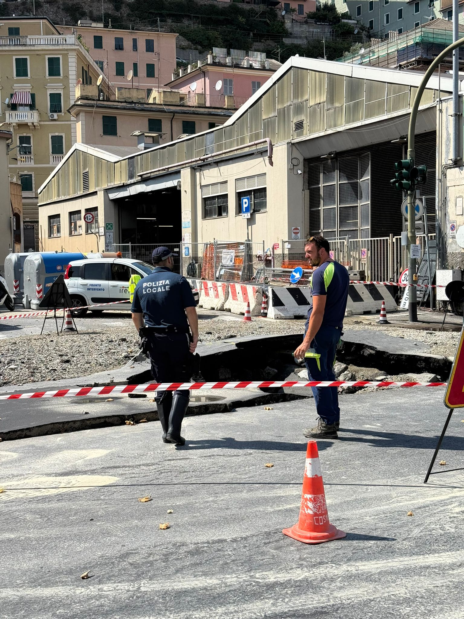 Gli agenti della locale hanno chiuso via Montaldo in direzione levante, deviando il traffico su corso Montegrappa e via Burlando. Chiuso anche il tunne di Staglieno in direzione mare, con le auto che devono obbligatoriamente passare sulla piastra Genova Est per la direzione Lungobisagno Istria. Chiusa anche via Bobbio in direzione monte, traffico deviato verso ponte Spemsley. Deviate anche diverse linee del bus visto la vicinanza dell'asfalto distrutto con la rimessa amt di via Bobbio.