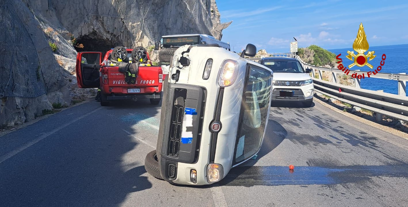 I vigili del fuoco del distaccamento di Finale Ligure sono intervenuti sulla via Aurelia, in corrispondenza delle curve di Capo Noli, per un'auto che è finita su un fianco.