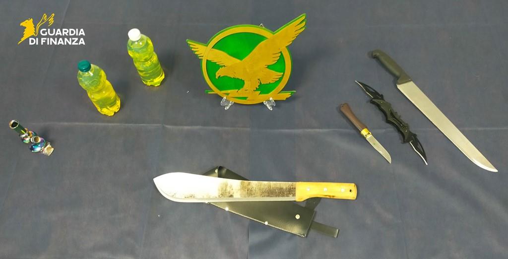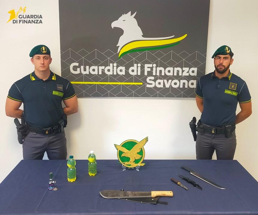 All'interno dell'auto sono stati trovati due machete, due coltelli, due bottiglie contenenti benzina e hashish. Il conducente del mezzo non è stato in grado di fornire alle Fiamme Gialle savonesi giustificazione sul possesso e porto delle armi e dei liquidi infiammabili che sono stati sequestri.