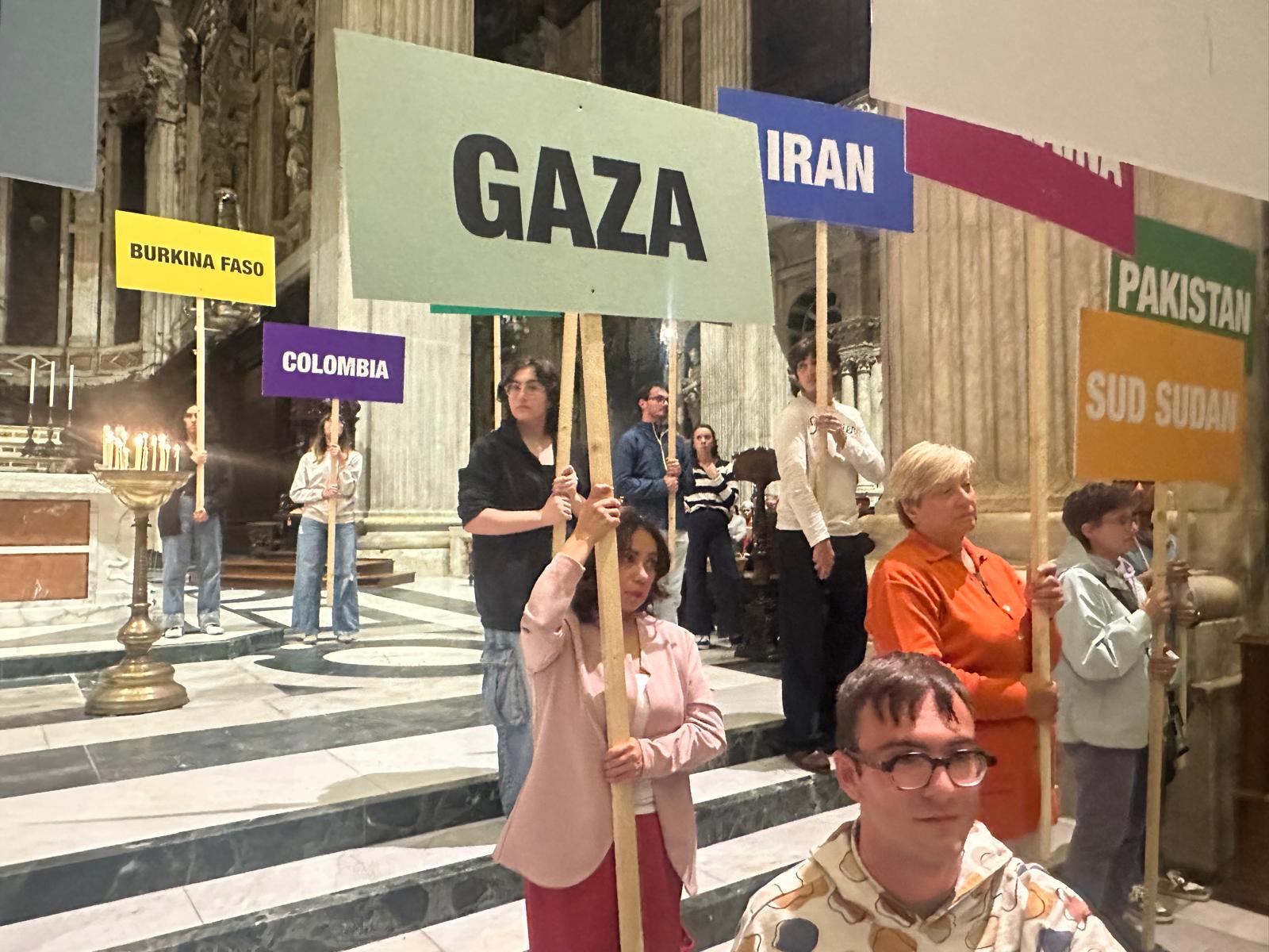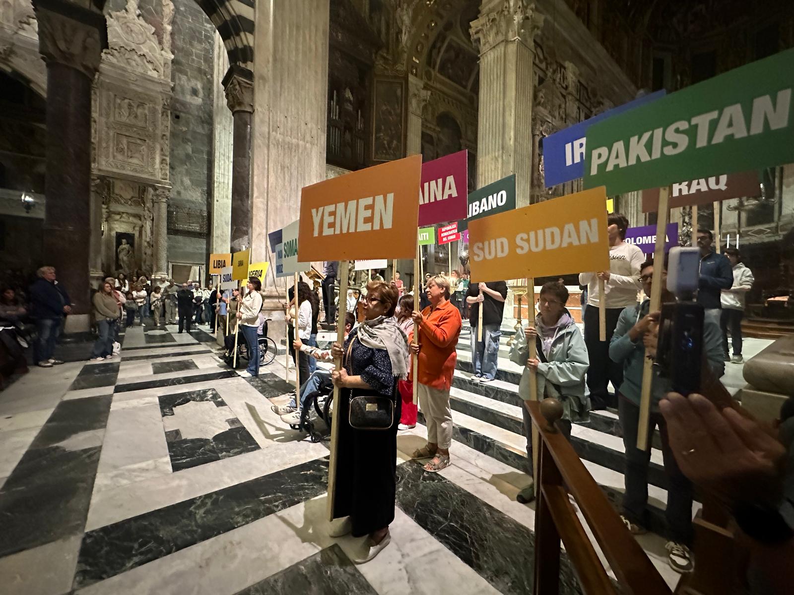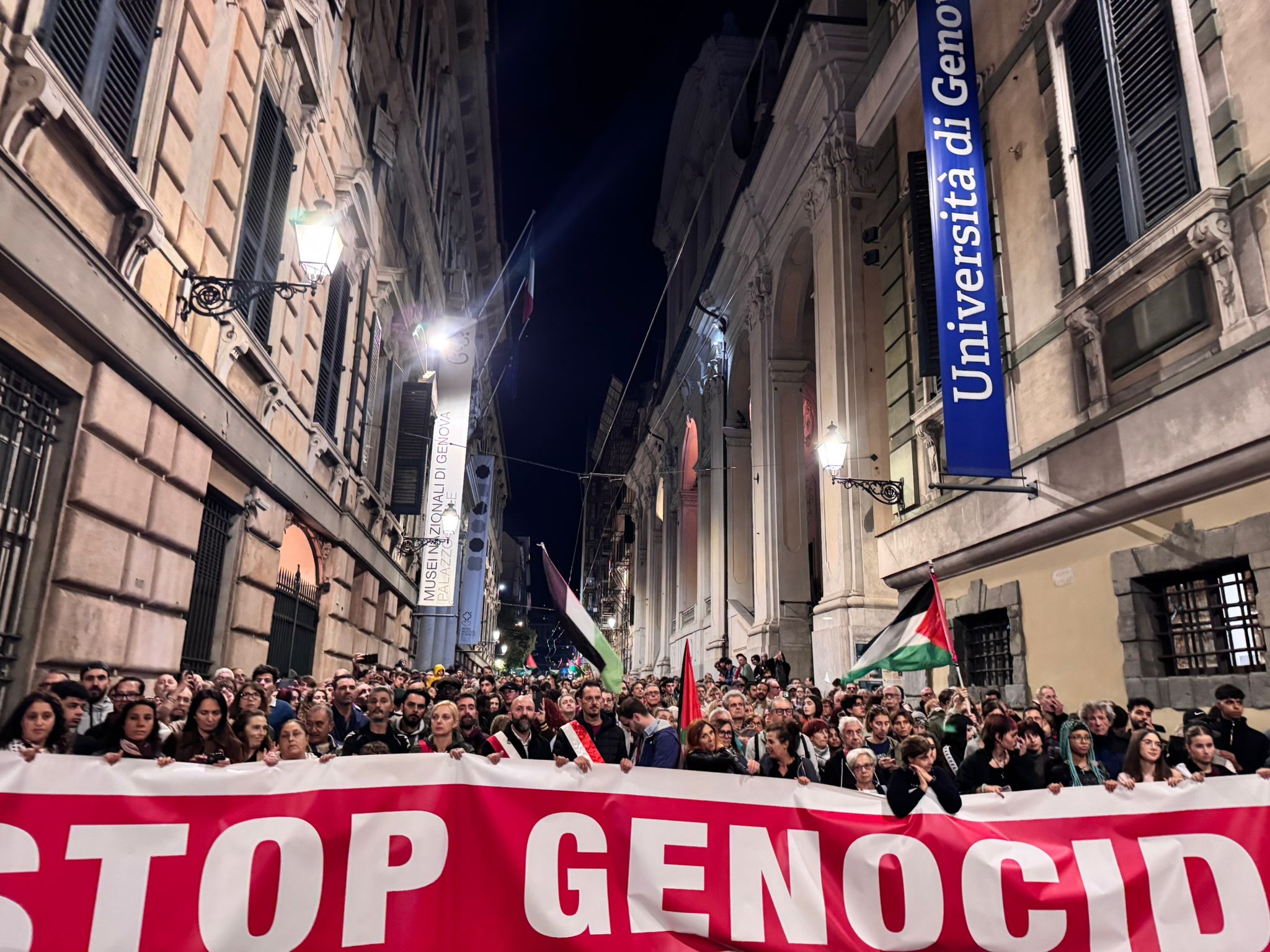 Un presidio a sostegno dei portuali che nel mentre, sono riusciti a fermare i lavori in porto: la nave è ripartita vuota. Contemporaneamente, come da programma, il corteo è partito con direzione piazza Matteotti. La fiaccolata si è poi fermata in via Balbi, davanti al rettorato, per un simbolico saluto agli studenti che da martedì hanno occupato i locali della sede della facoltà. Strette di mano e applausi che sono continuati fino in piazza Matteotti, dove c'è stato il ricongiungimento con i partecipanti alla veglia organizzata dentro la Cattedrale di San Lorenzo con l'arcivescovo di Genova Marco Tasca, il presidente della Regione Marco Bucci e la sindaca Silvia Salis.