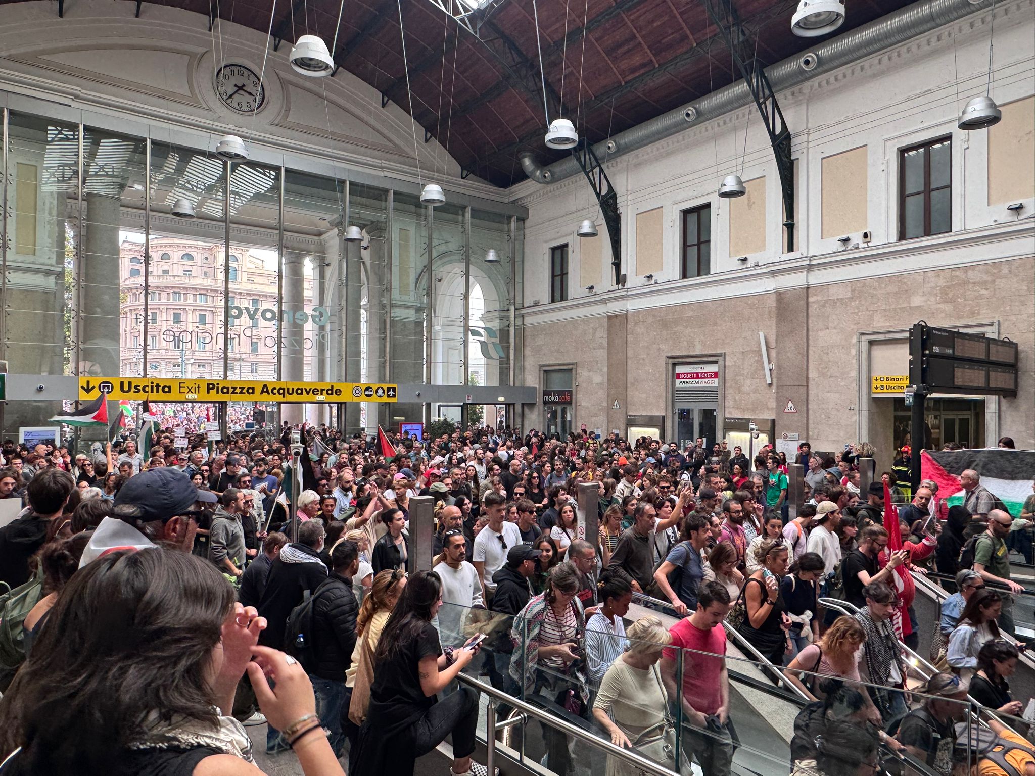 Ore 18.15: i manifestanti stanno lasciando lentamente la stazione Principe. "Abbiamo notizie rassicuranti sulle condizioni dei detenuti, sono in corso le visite del console ma in teoria entro 72 ore dovrebbero uscire, essere imbarcati su un charter e ritornare in Italia"