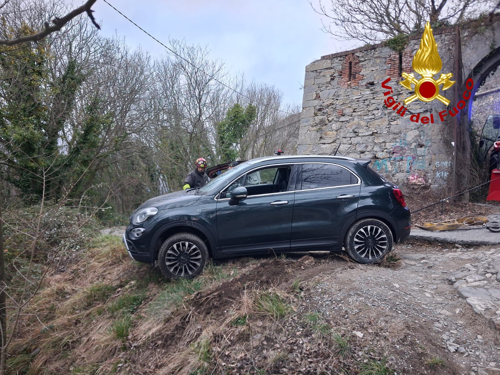 La notte dei vigili del fuoco di Genova si è conclusa con il recupero di una autovettura al forte Sperone. Il conducente della macchina, facendo manovra, non si è accorto della scarpata e vi è scivolato dentro finendo la corsa appoggiato a un albero.