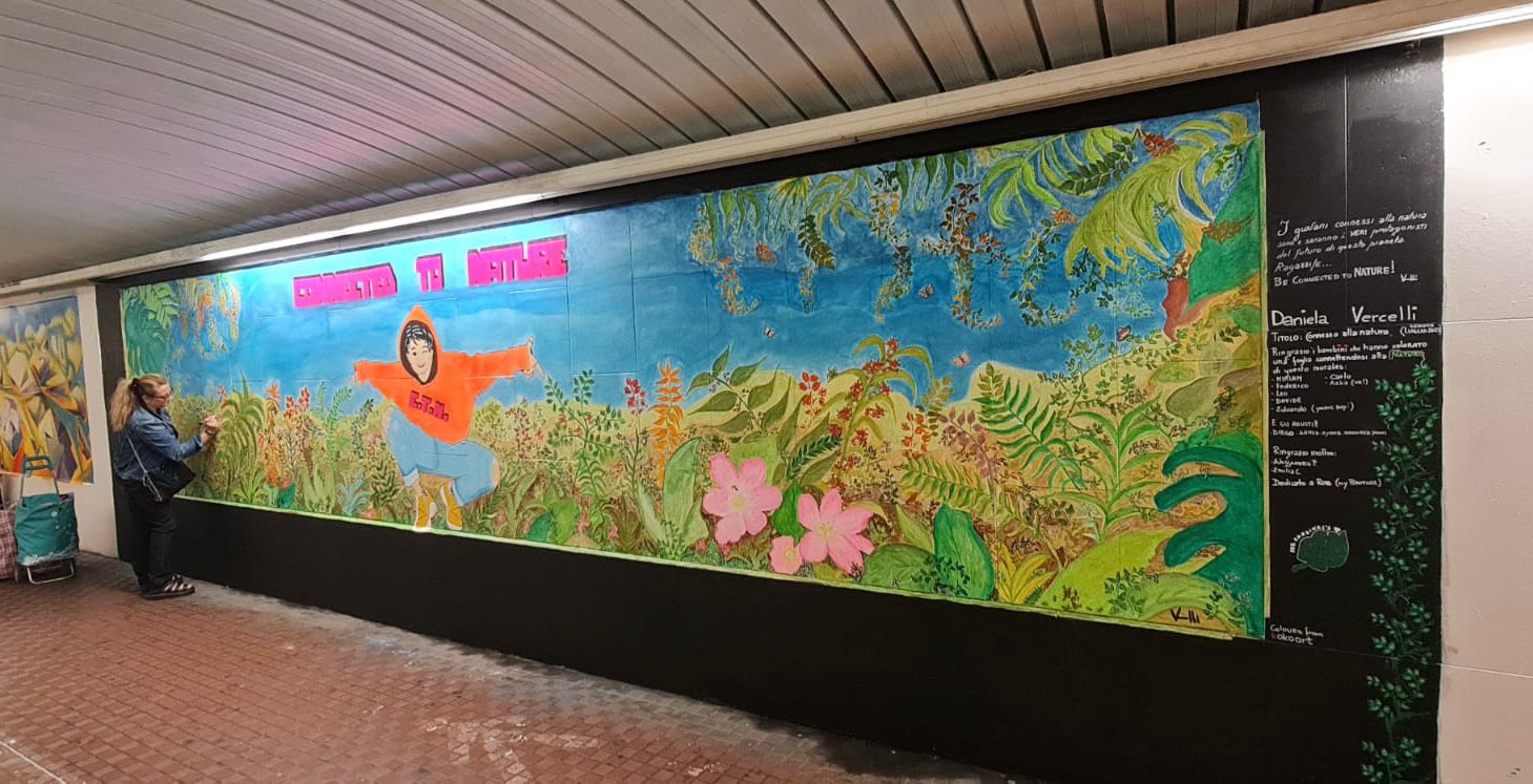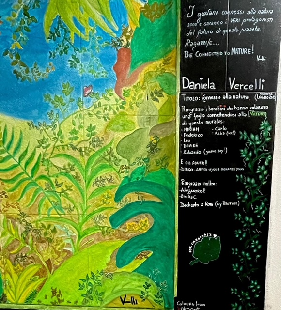 GENOVA - "Ringrazio i bambini che hanno colorato una foglia connettendosi alla natura di questo murales: Miriam, Carlo, Federico, Alba, Leo, Davide ed Edoardo". L'artista Daniela Vercelli ha voluto con questo messaggio ringraziare scritto accanto al murale i tanti bambini ma anche giovani ragazzi e adulti che si sono fermati a dare una pennellata al murale che ha realizzato lungo il tunnel pedonale di Borgo Incrociati a Genova.