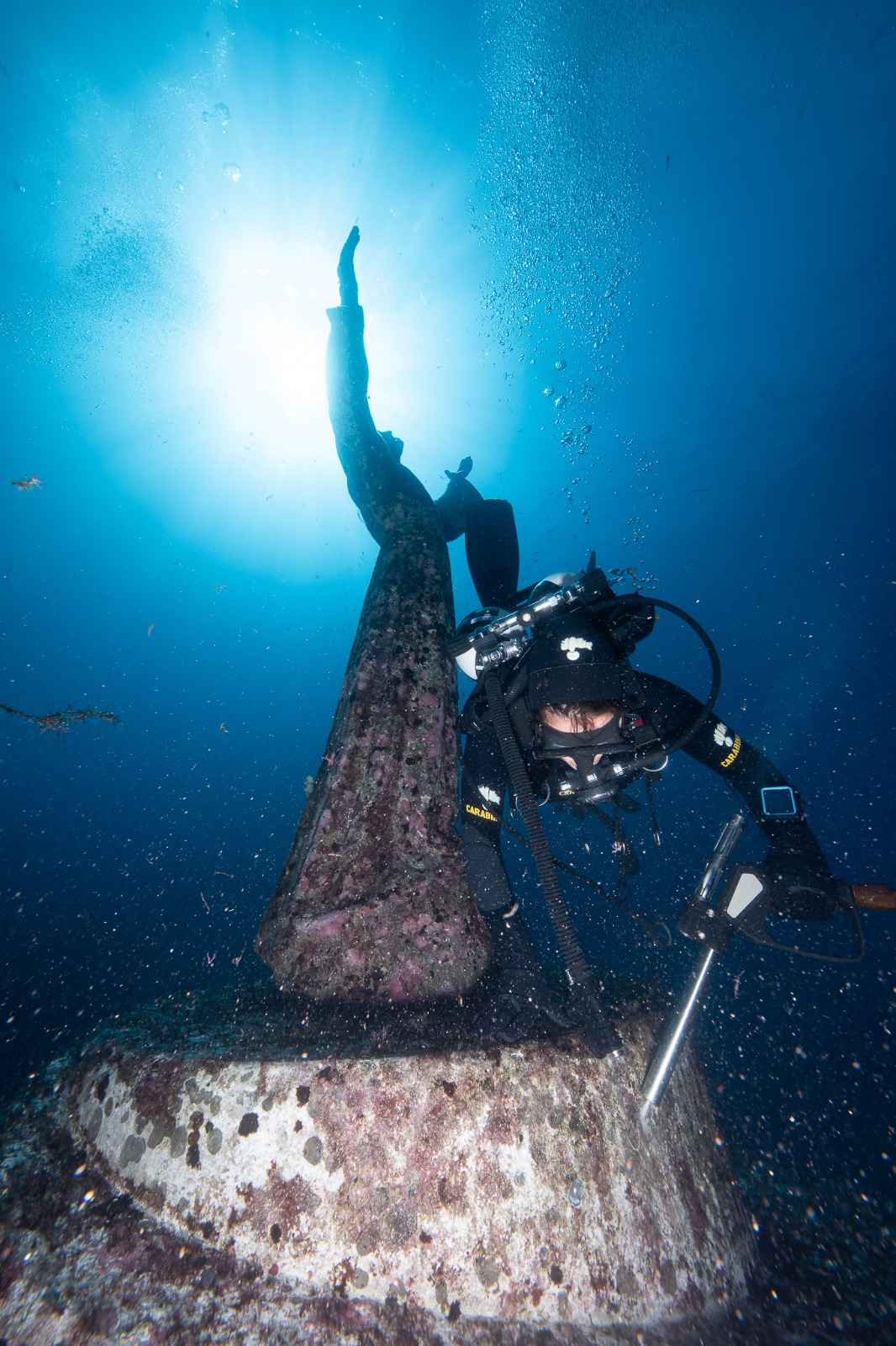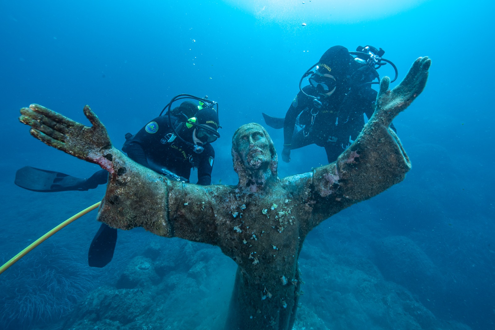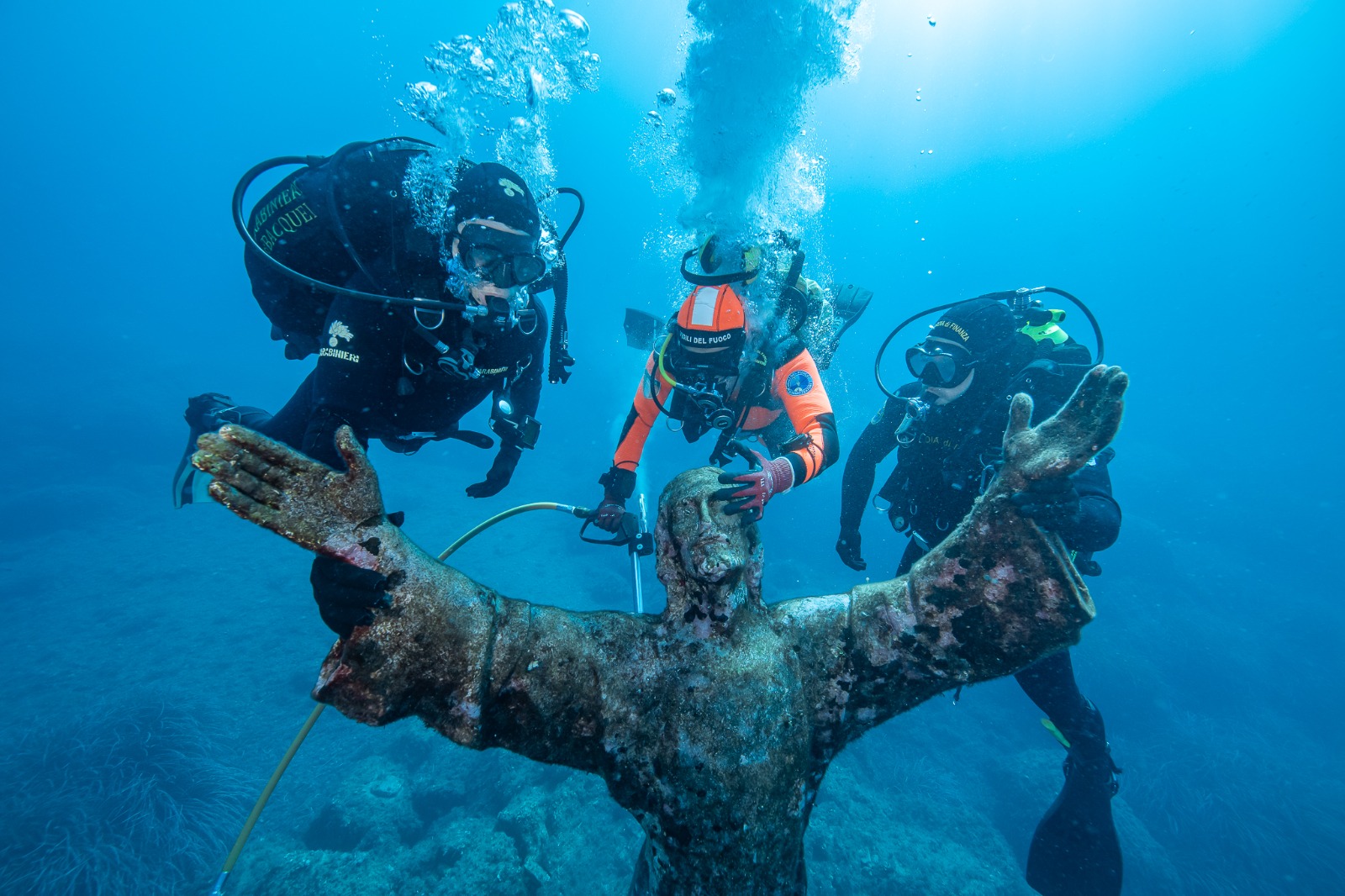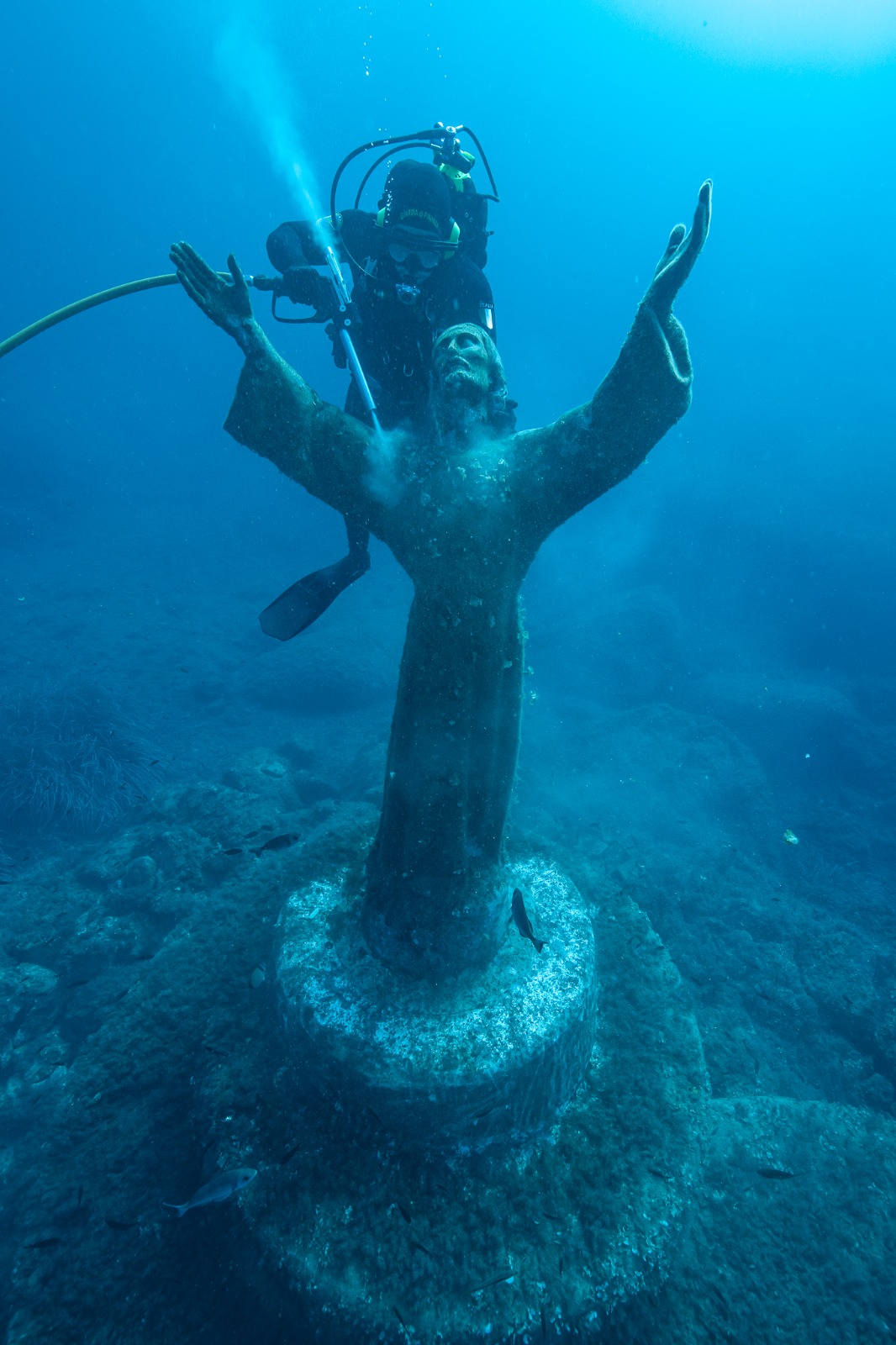 SAN FRUTTUOSO - A 18 metri di profondità per pulire il Cristo degli Abissi: anche quest'anno la squadra subacquea coordinata dalla Soprintendenza si è ritrovata nella baia di San Fruttuoso, sotto il monte di Portofino, per una giornata davvero speciale. Un gioco di squadra che mette insieme dal 2008 ad oggi ogni anno tutti i corpi subacquei delle forze dell'ordine, dai vigili del fuoco ai carabinieri, dalla polizia di Stato alla Guardia Costiera, dalla Marina Militare alla Guardia di Finanza che mette a disposizione la propria idropulitrice per il delicato intervento. Pochi giorni fa, il 29 settembre, la statua di Guido Galletti, realizzata grazie alla fusione di medaglie di Caduti donate dalle mamme e dalle vedove, medaglie di atleti, parti di navi, eliche, campane e cannoni, ha compiuto 69 anni. E dal 1954 ad oggi, l'azione dell'acqua più che del tempo ha deteriorato pian piano questa scultura, di cui esistono altre due copie: una è conservata all'interno dell'Abbazia di San Fruttuoso, l'altra in Florida.
