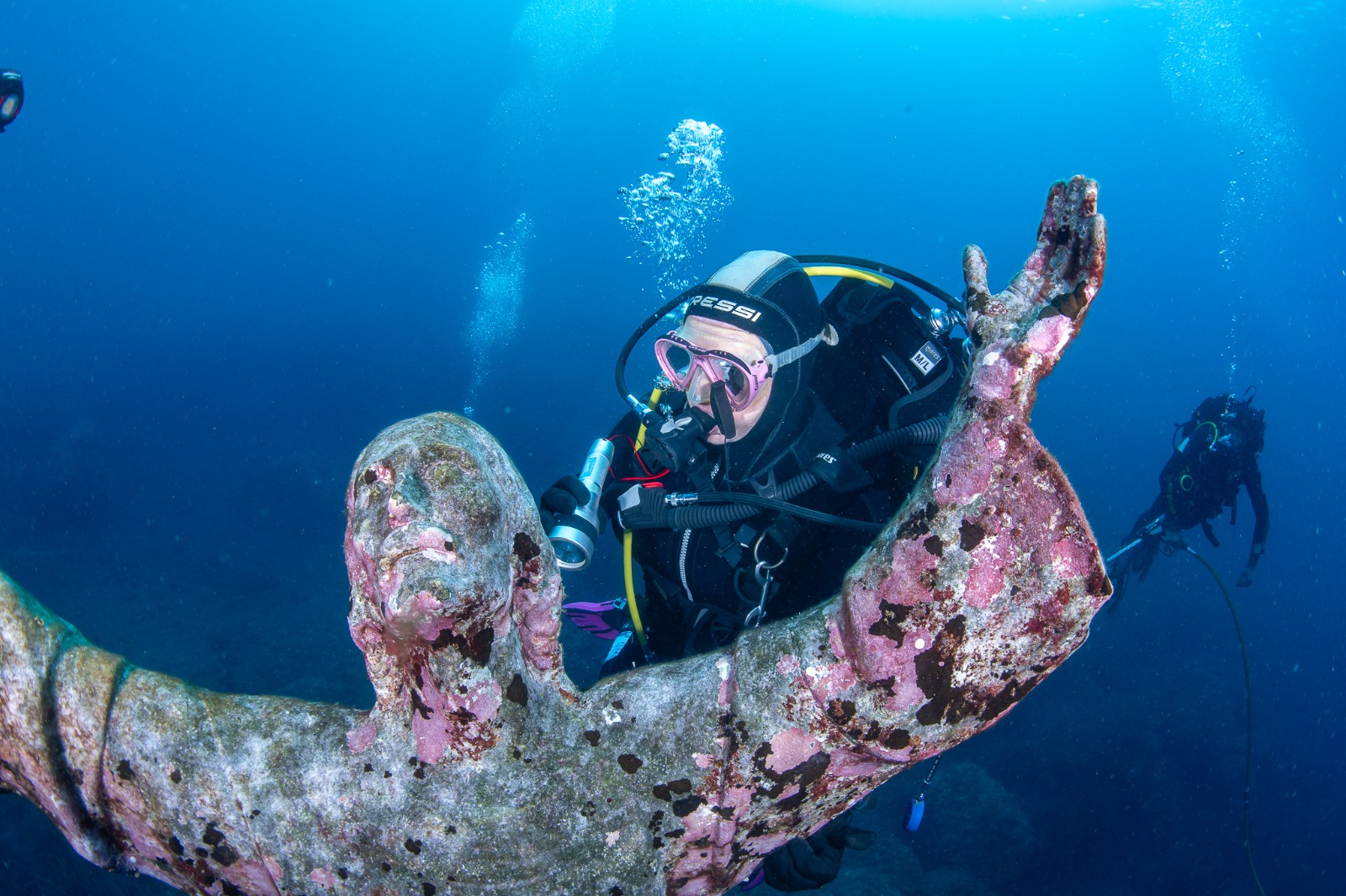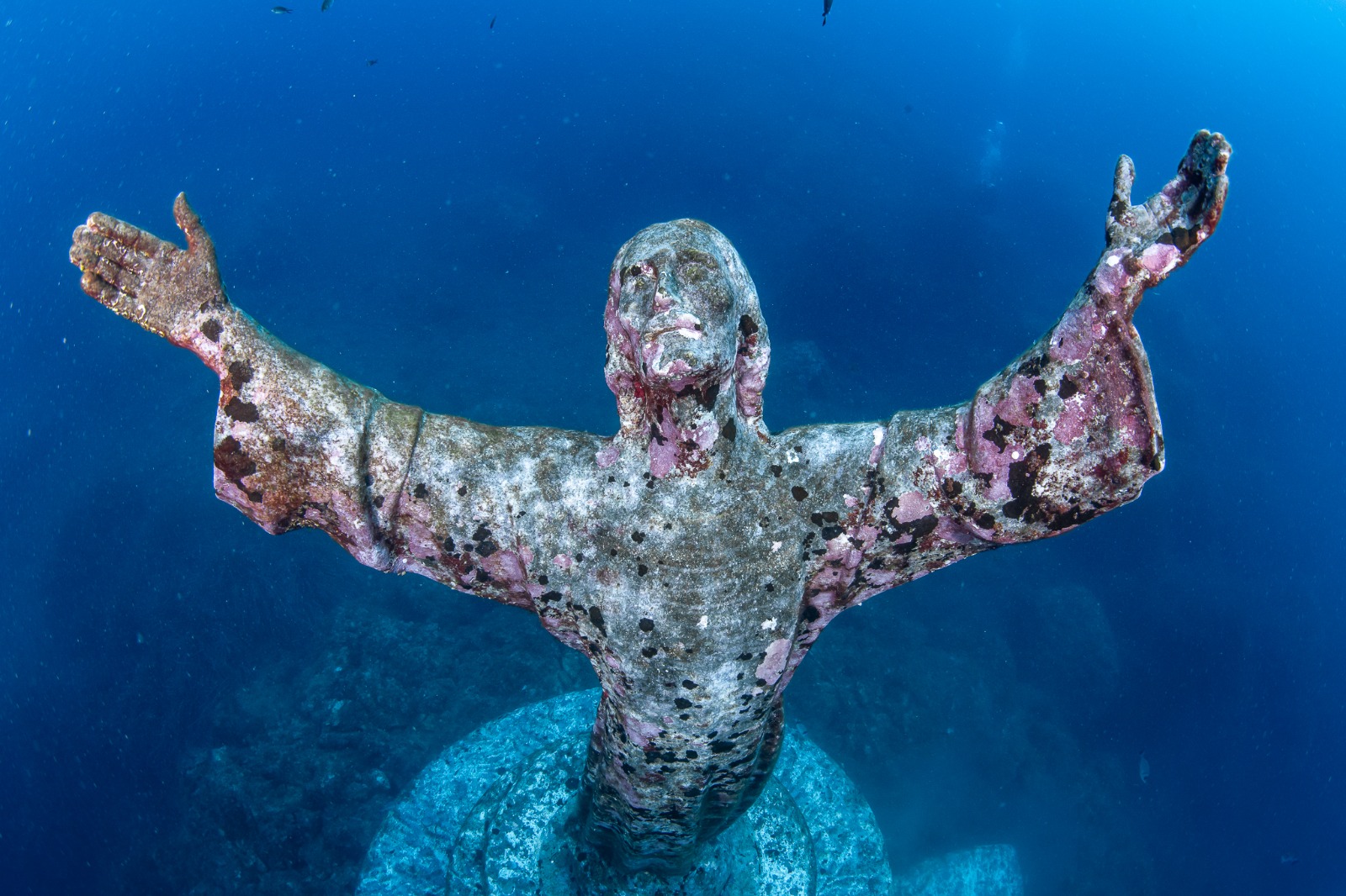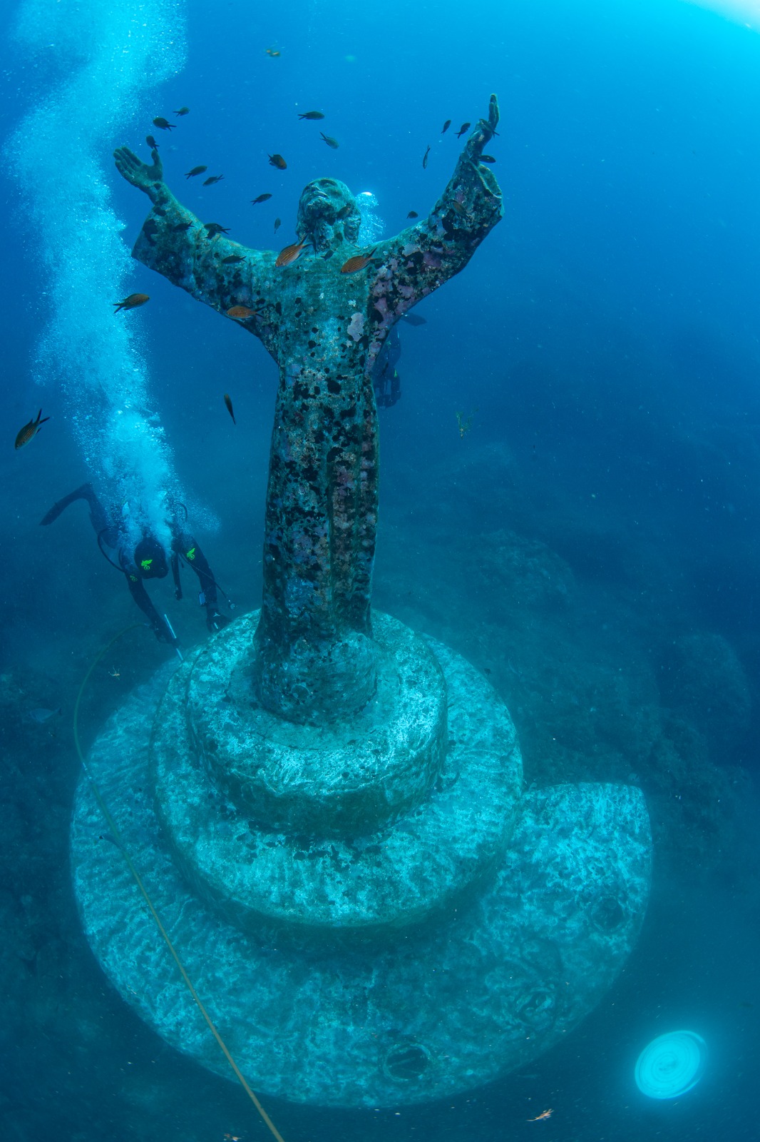 Alta due metri e mezzo e dal peso di 260 chili, per la sua realizzazione furono raccolte e fuse dallo scultore Guido Galletti medaglie di Caduti donate dalle mamme e dalle vedove, medaglie di atleti, parti di navi, eliche, campane e cannoni… ideata e calata sul fondale nel 1954 da Duilio Marcante e dai grandi pionieri della subacquea ligure su un fondale di 18 m. nella baia antistante San Fruttuoso di Camogli, la statua è un tributo alla memoria di tutte le vite perse in mare, a partire da quella di Dario Gonzatti, pioniere subacqueo e amico dello stesso Marcante. È il punto che registra il maggior numero di immersioni nel Mediterraneo. La manutenzione del Cristo degli Abissi non è una semplice questione estetica: gli organismi incrostanti di “biofouling” creano un biofilm batterico (che colonizza e prolifera su qualsiasi superficie in mare), creando seri problemi di biodeterioramento. Settant’anni fa, per rendere stabile sul fondale la statua, nata cava, fu inserito al suo interno del calcestruzzo con tondini di ferro: coi due diversi metalli a contatto nel mare si creano correnti galvaniche a detrimento del bronzo, gravemente rovinato nei suoi primi cinquant’anni da continue, aggressive e incontrollate ripassature coi denti delle spazzole di ferro da parte dei subacquei: “È un bronzo sofferente perché aggredito e assottigliato per decenni da infiniti e indiscriminati colpi di spazzola metallica e, come se non bastasse, indebolito delle correnti galvaniche” (Cabella).