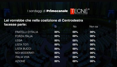 Campione di 601 casi, rappresentativo della popolazione maggiorenne residente in Liguria, articolato per provincia, genere ed età - Estensione territoriale: territorio regionale. Interviste effettuate tra l'11 e il 12 luglio 2024 con metodo cati – cawi. Totale contatti: 4.277 (100,0%); rispondenti 600 (14,0%) - rifiuti e sostituzioni: 3.677 (86,0%). Margine di errore: + -4,0%. Soggetto che ha realizzato il sondaggio: Tecnè srl – Committente: P.T.V. Programmazioni Televisive S.p.A. - Il documento relativo al sondaggio sul sito: sondaggipoliticoelettorali.it o agcom.it