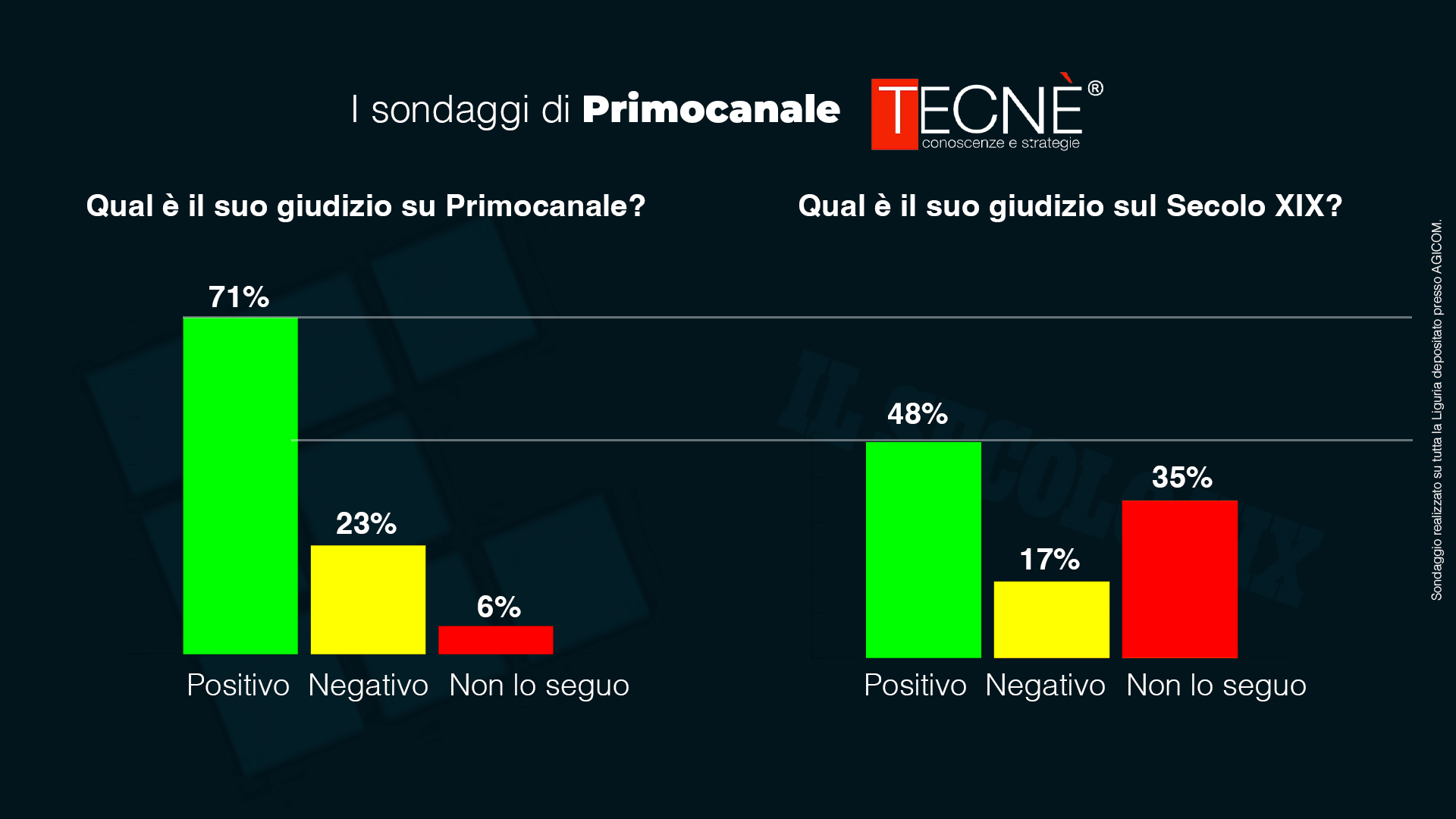 Hanno un parere positivo di Primocanale il 71% dei cittadini contro il 48% del Secolo XIX. Ed hanno un parere negativo di Primocanale il 23% contro il 17% del Secolo XIX.