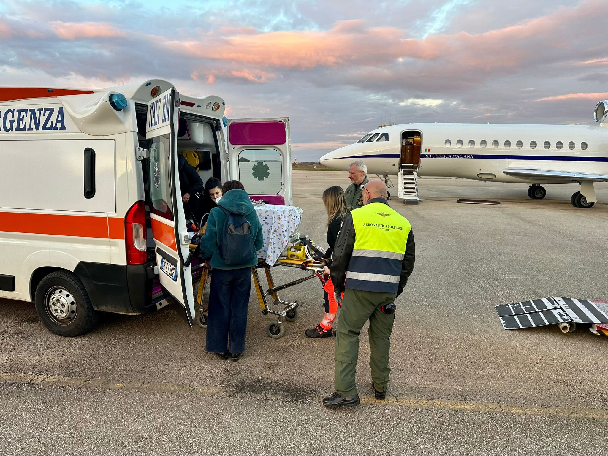 Il trasbordo del bimbo dal Falcon 900 all'ambulanza