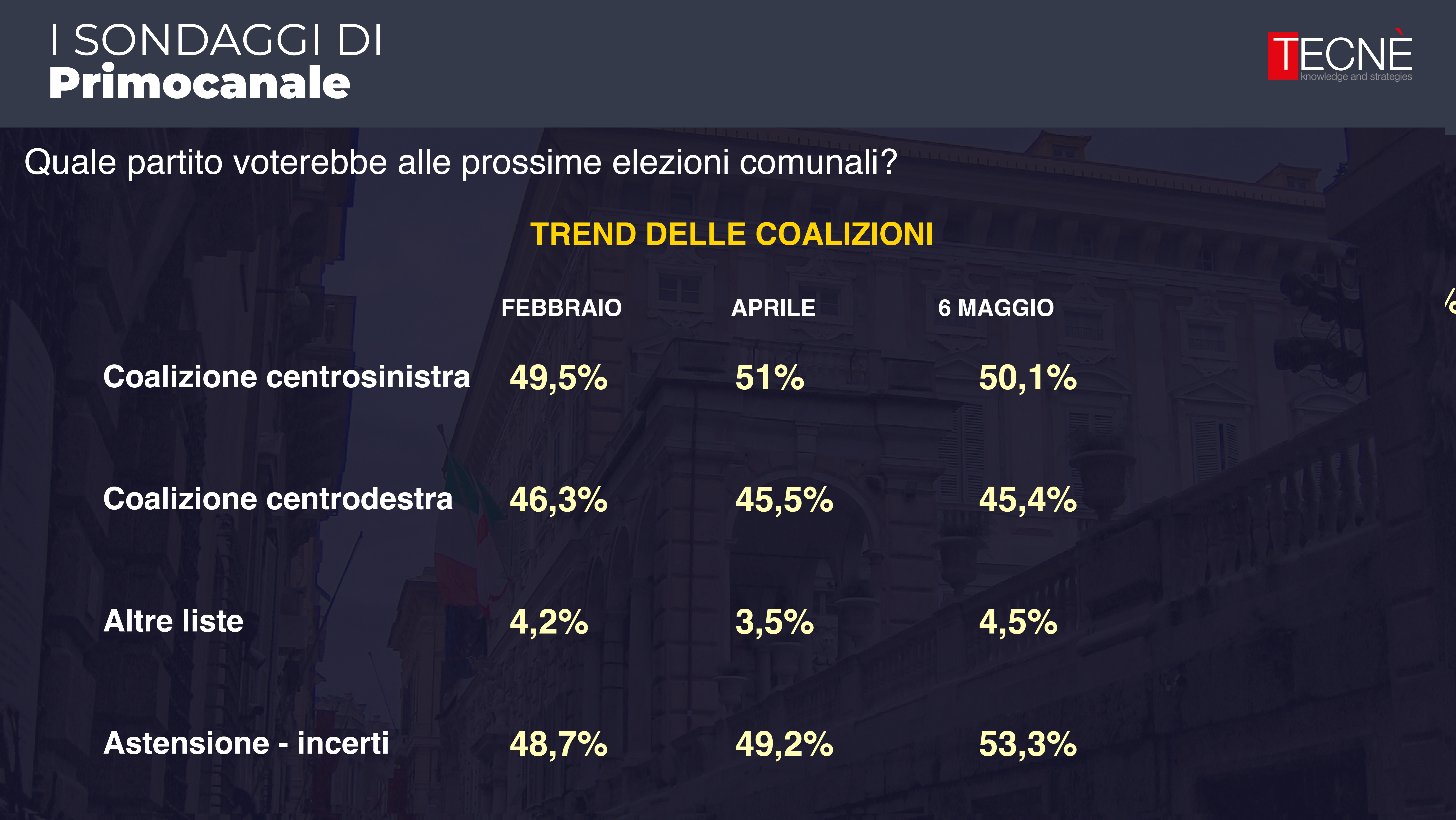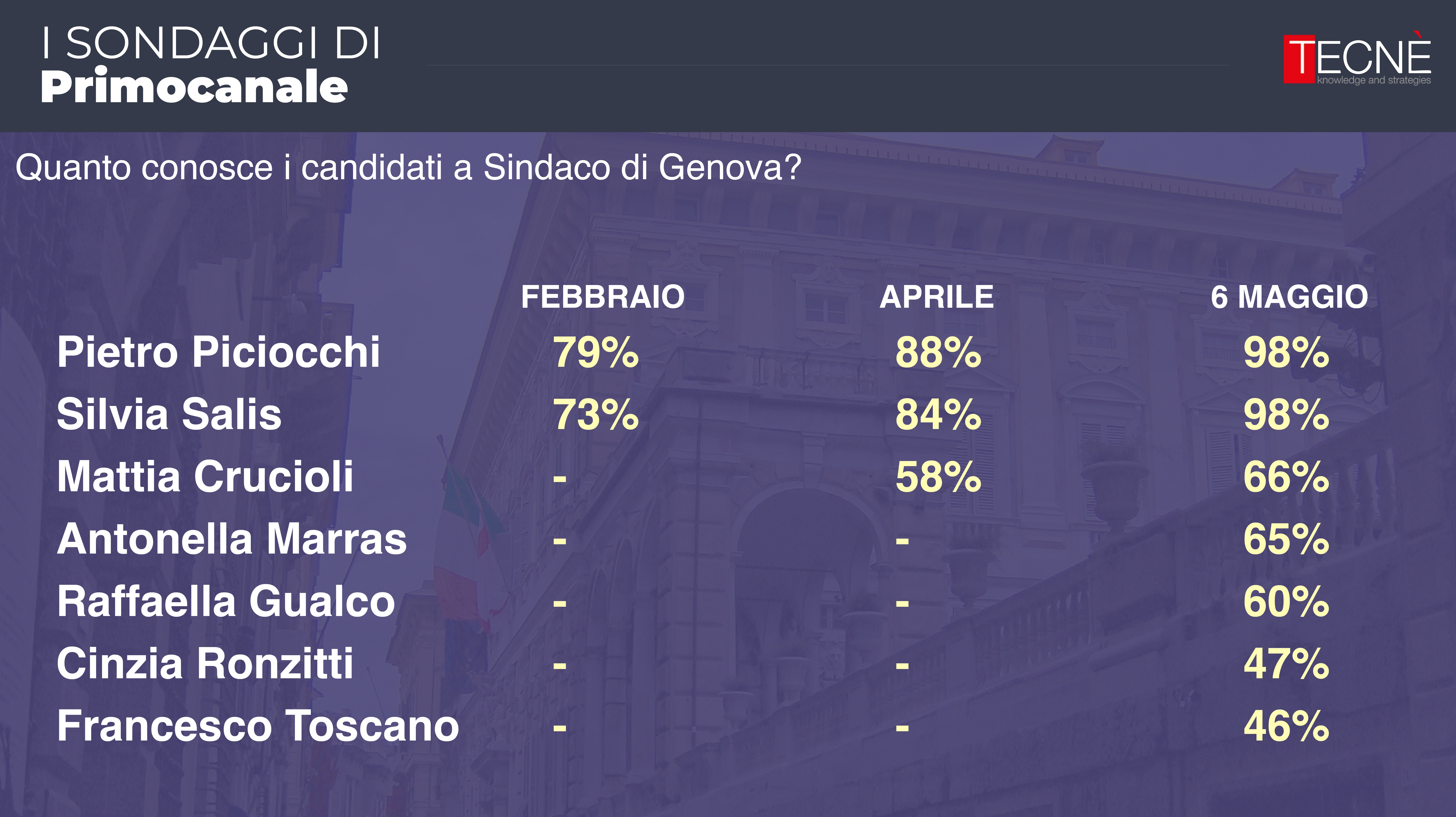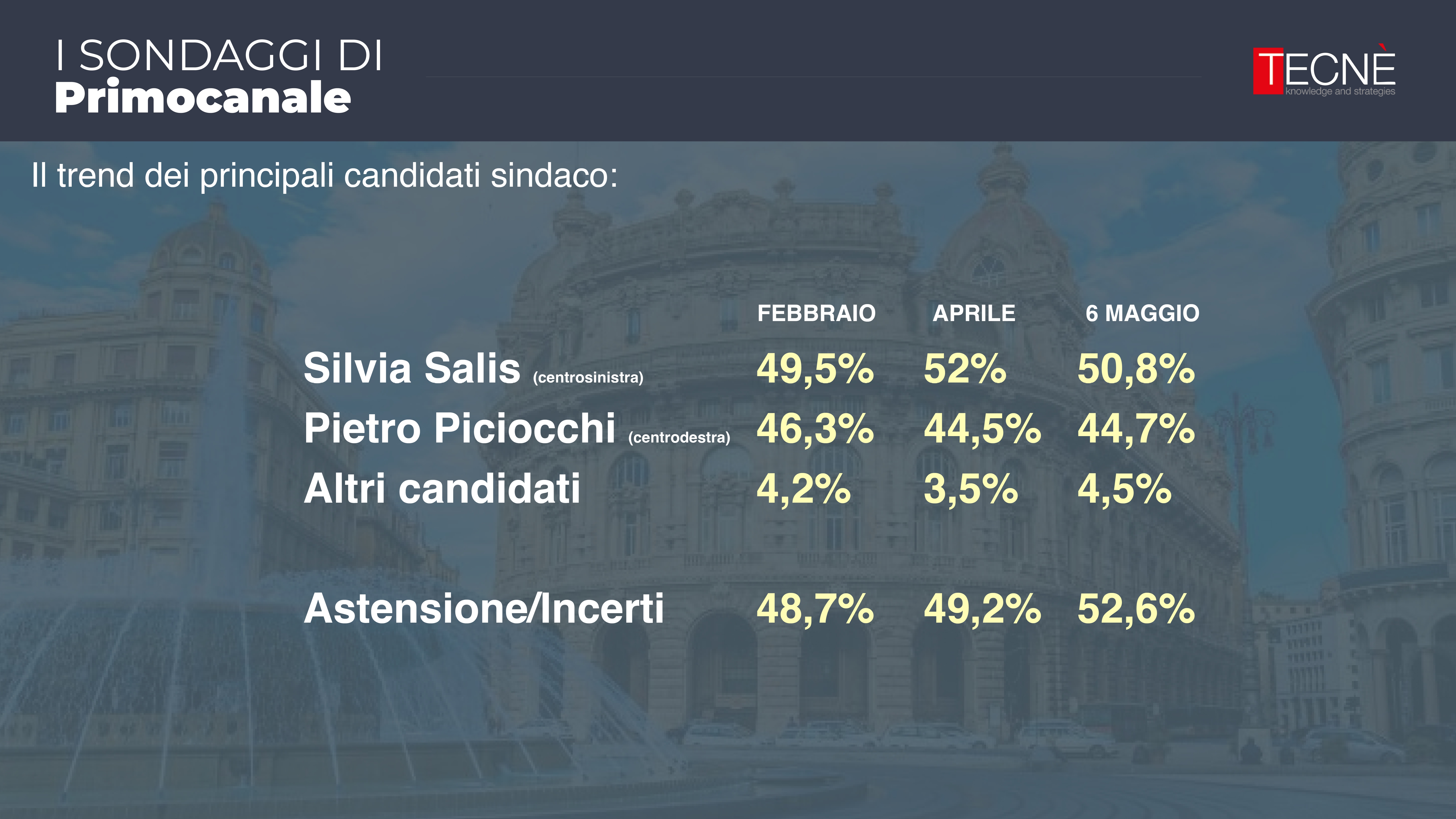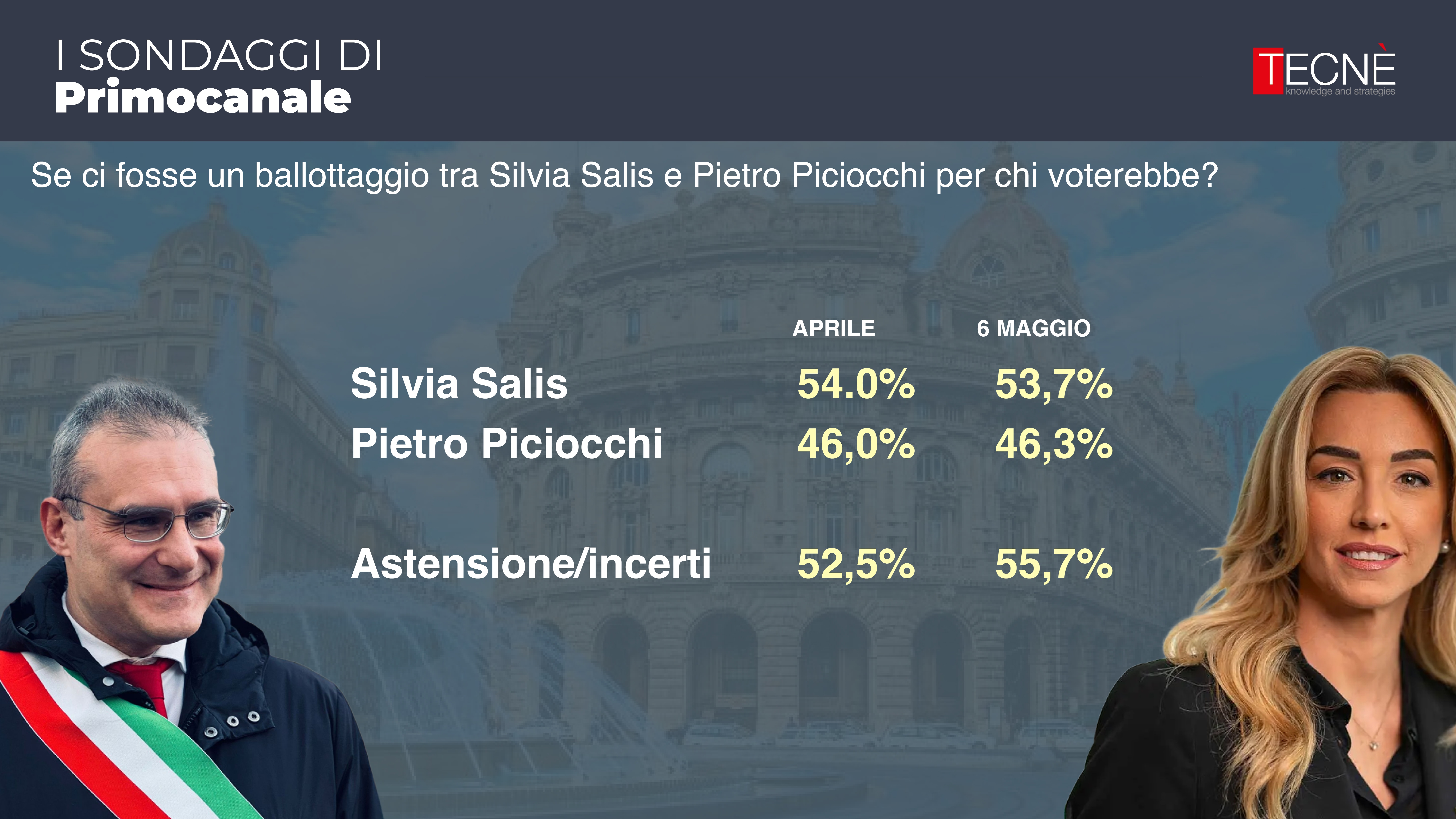 Dopo le rilevazione di febbraio e aprile, oggi Primocanale in collaborazione con l'istituto di ricerca Tecné è in grado di fornire l'ultimo sondaggio prima delle elezioni comunali di Genova del 25 e 26 maggio.