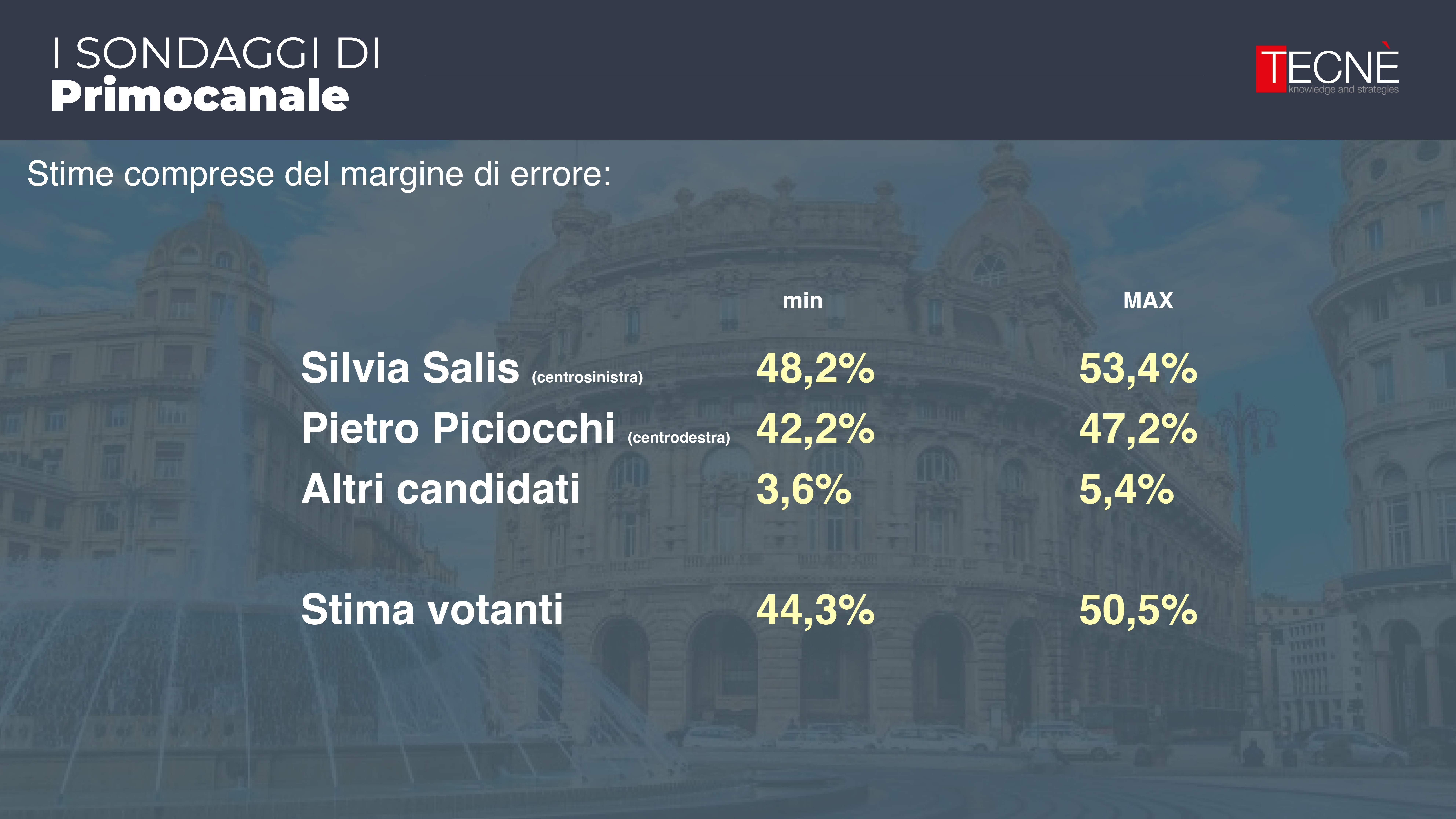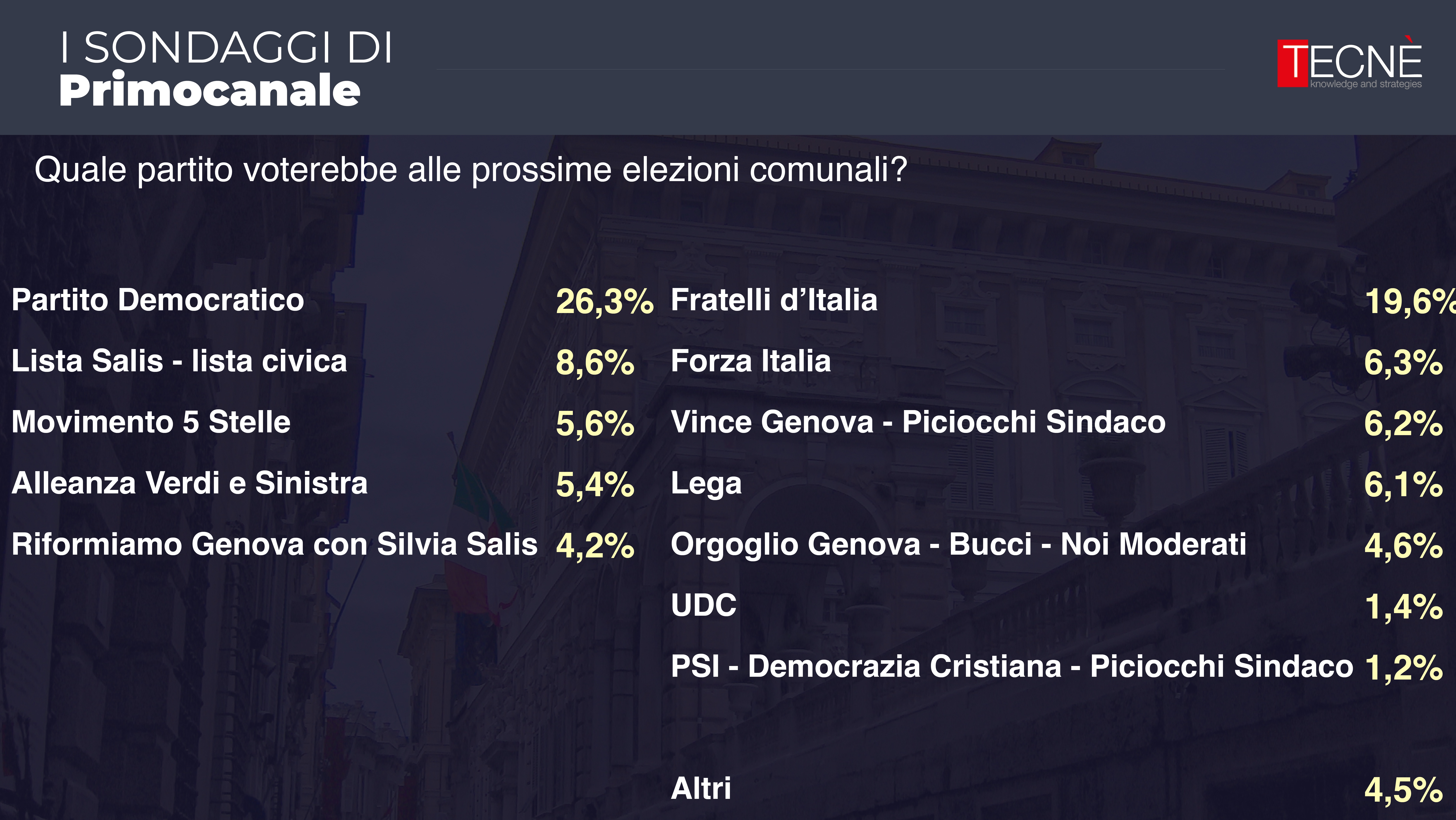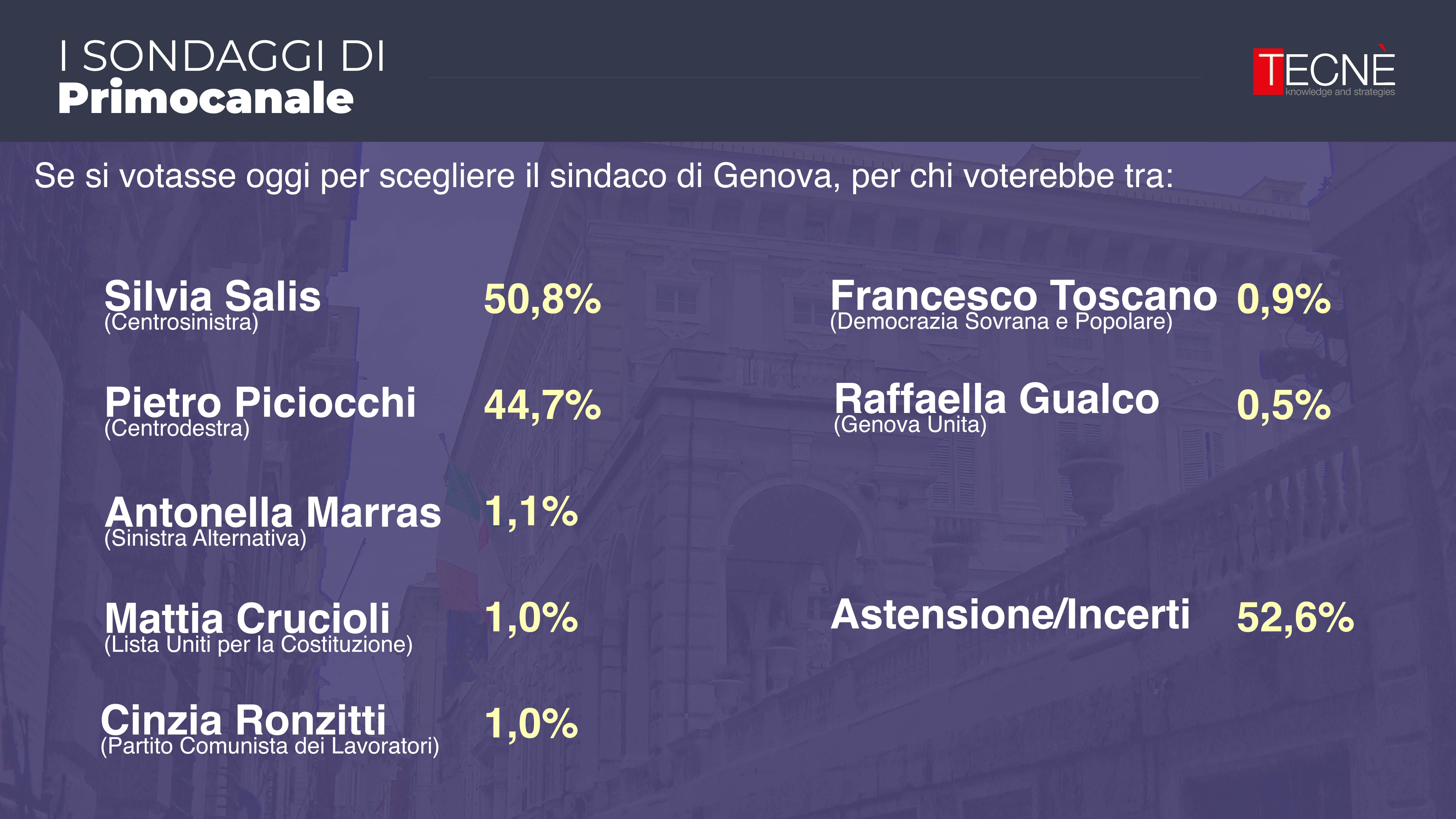Dopo le rilevazione di febbraio e aprile, oggi Primocanale in collaborazione con l'istituto di ricerca Tecné è in grado di fornire l'ultimo sondaggio prima delle elezioni comunali di Genova del 25 e 26 maggio.