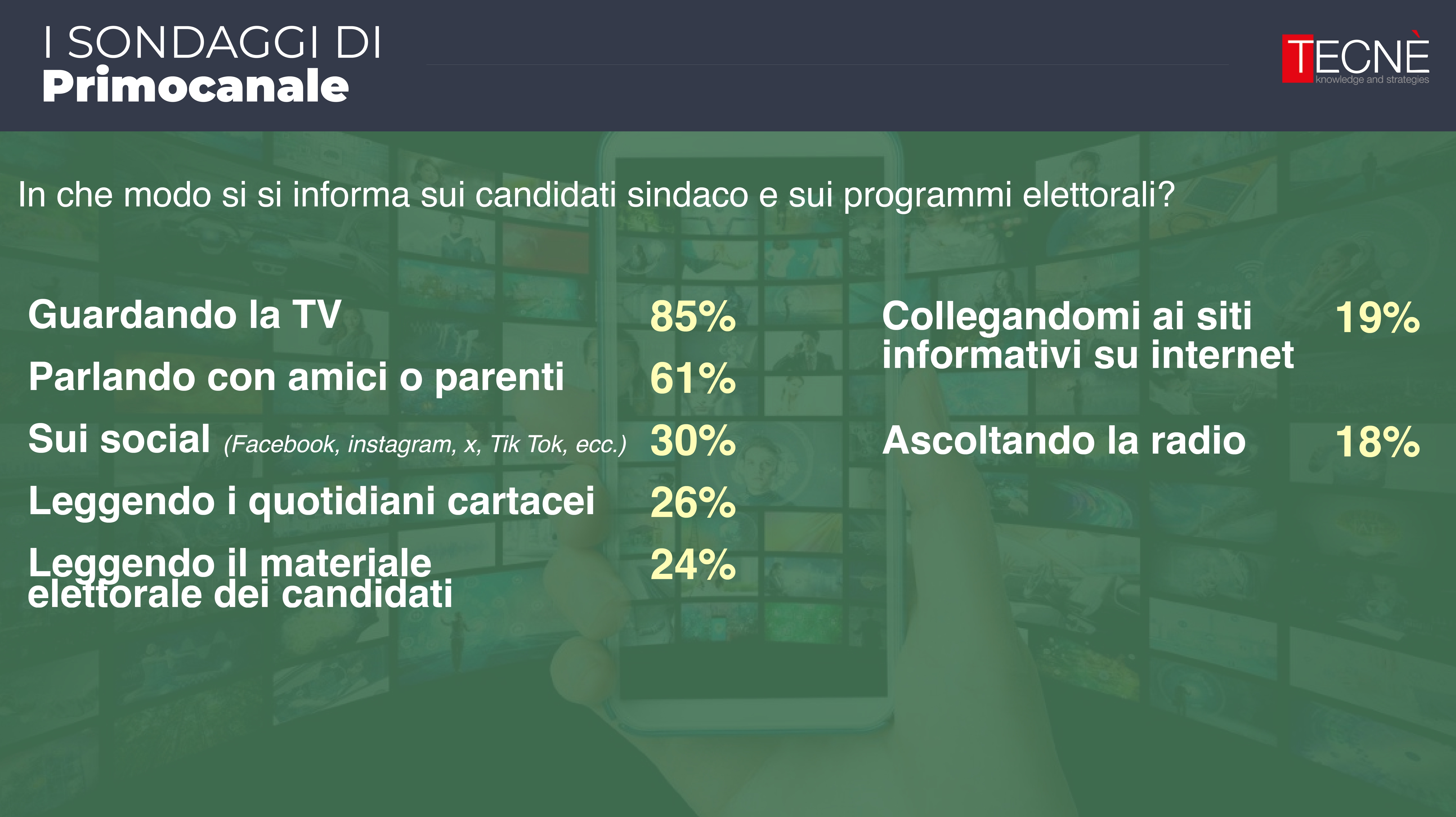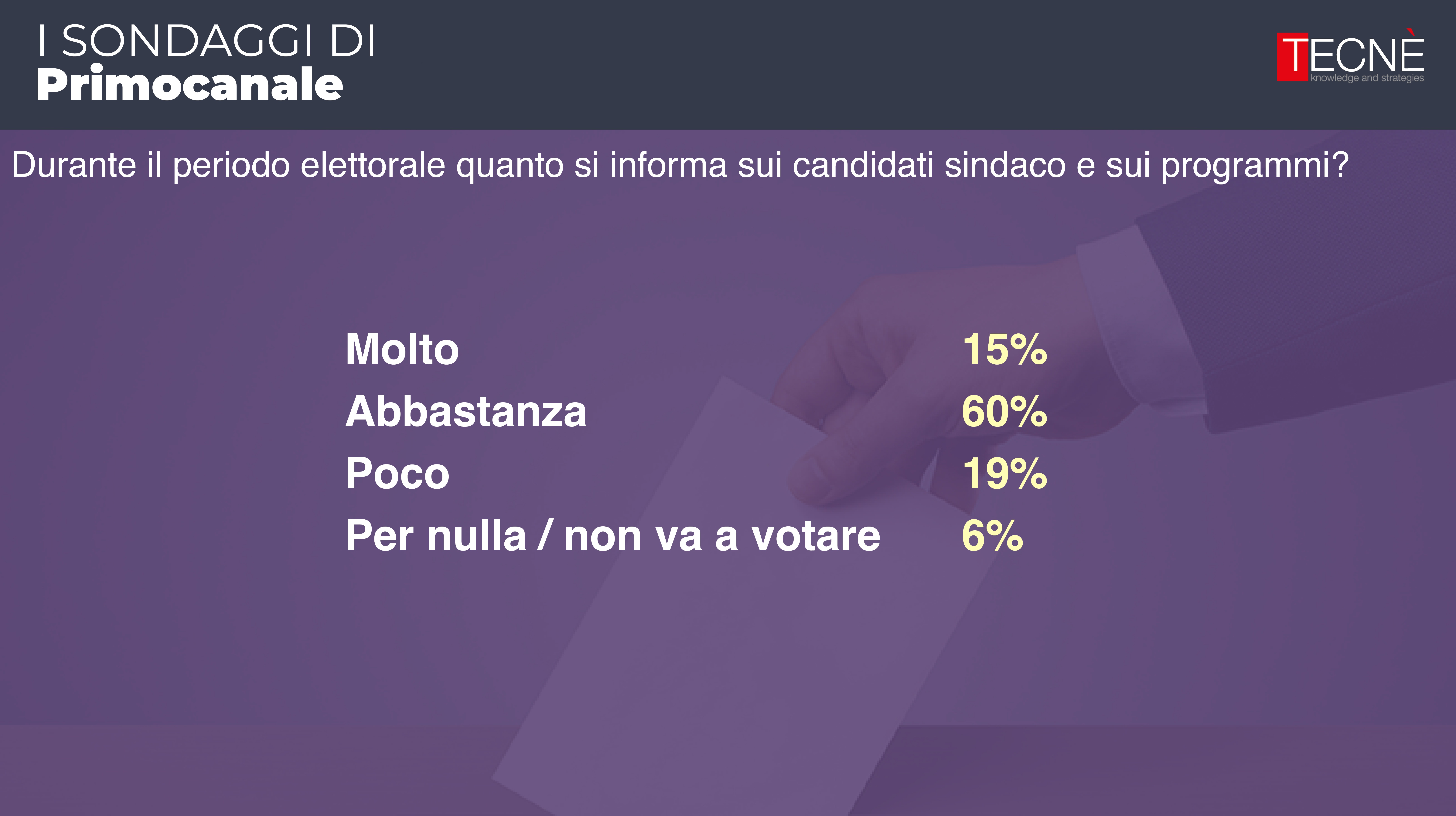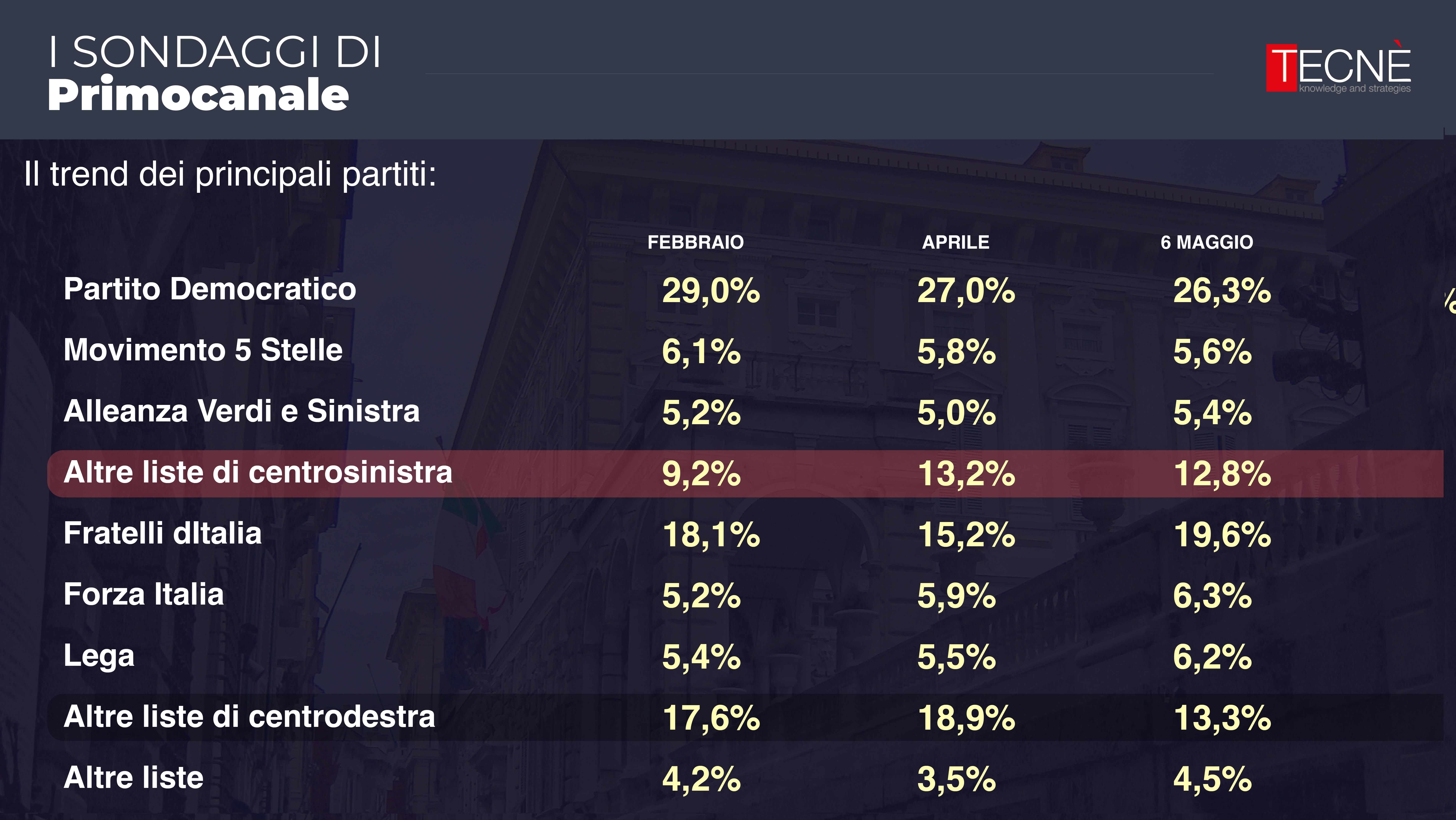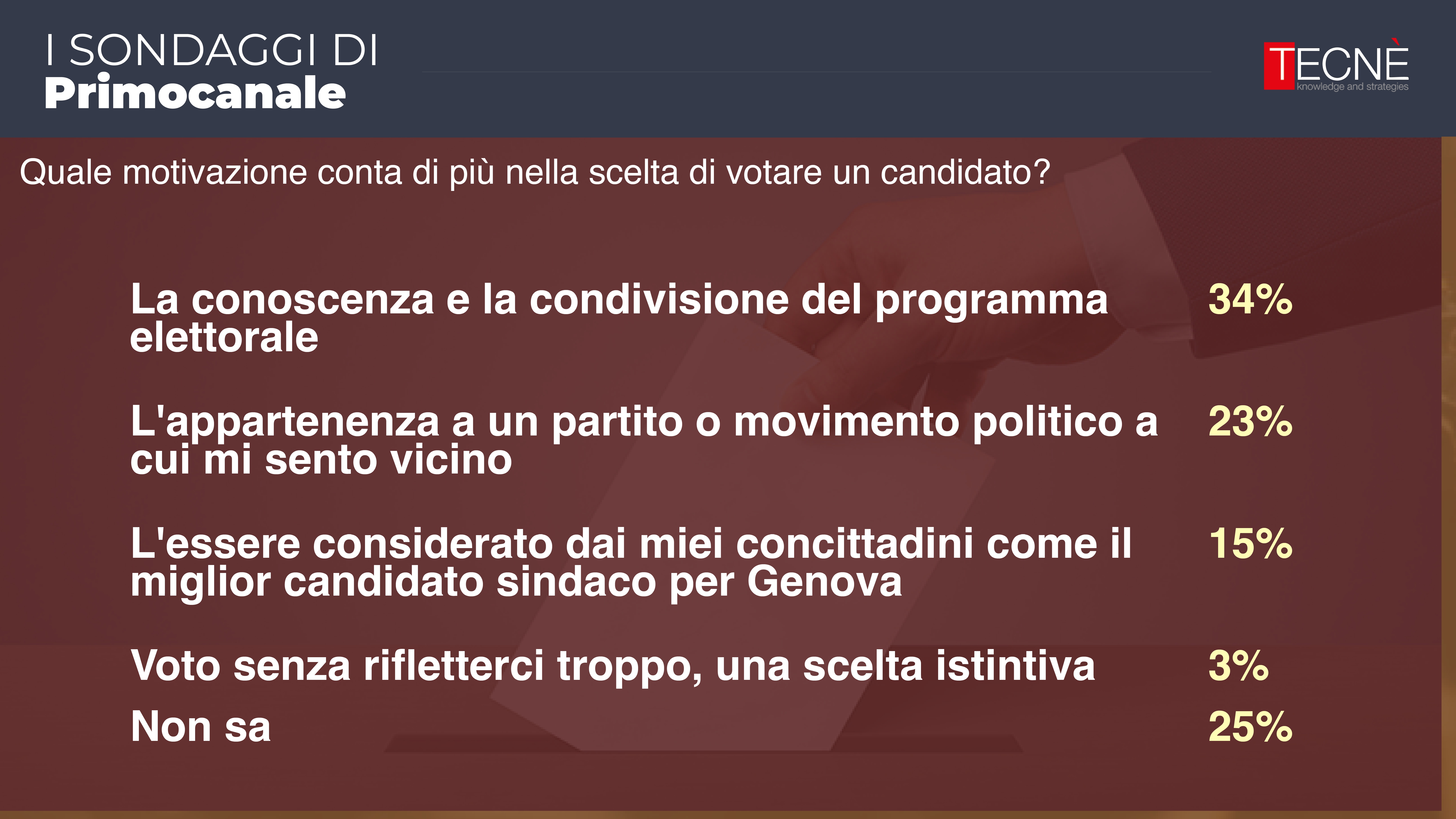 Dopo le rilevazione di febbraio e aprile, oggi Primocanale in collaborazione con l'istituto di ricerca Tecné è in grado di fornire l'ultimo sondaggio prima delle elezioni comunali di Genova del 25 e 26 maggio.