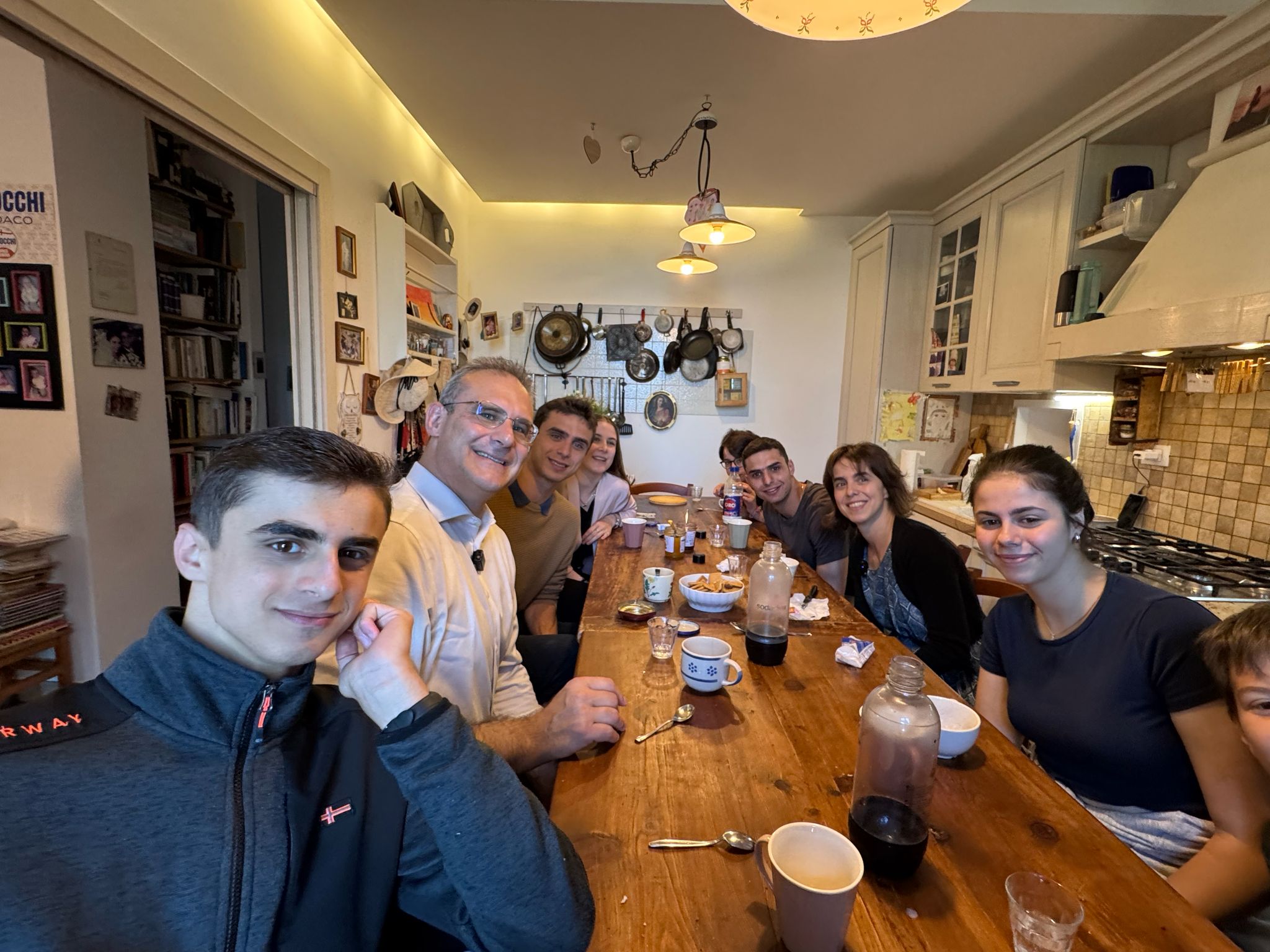 La prima tappa è la colazione in casa con la propria famiglia. "Mia moglie è fondamentale nella gestione di una famiglia così numerosa come la nostra - spiega Piciocchi - Come ci siamo conosciuti? Beh, è stata lei a cercarmi, io ero un po' imbambolato. Poi è nata la nostra storia d'amore. Mi sono sposato subito dopo laureato e all'inizio non guadagnavamo molto, ci hanno aiutato i nostri genitori. La fede nella vita è sempre stata centrale e ha dato uno slancio di coraggio e speranza nelle scelte fatte". Poi Piciocchi si sposta nel pollaio di casa dove tiene le sue galline. Il candidato poi si dirige verso la scuola dei figli e racconta che per 14 anni ha insegnato diritto pubblico all'Università Bocconi di Milano.