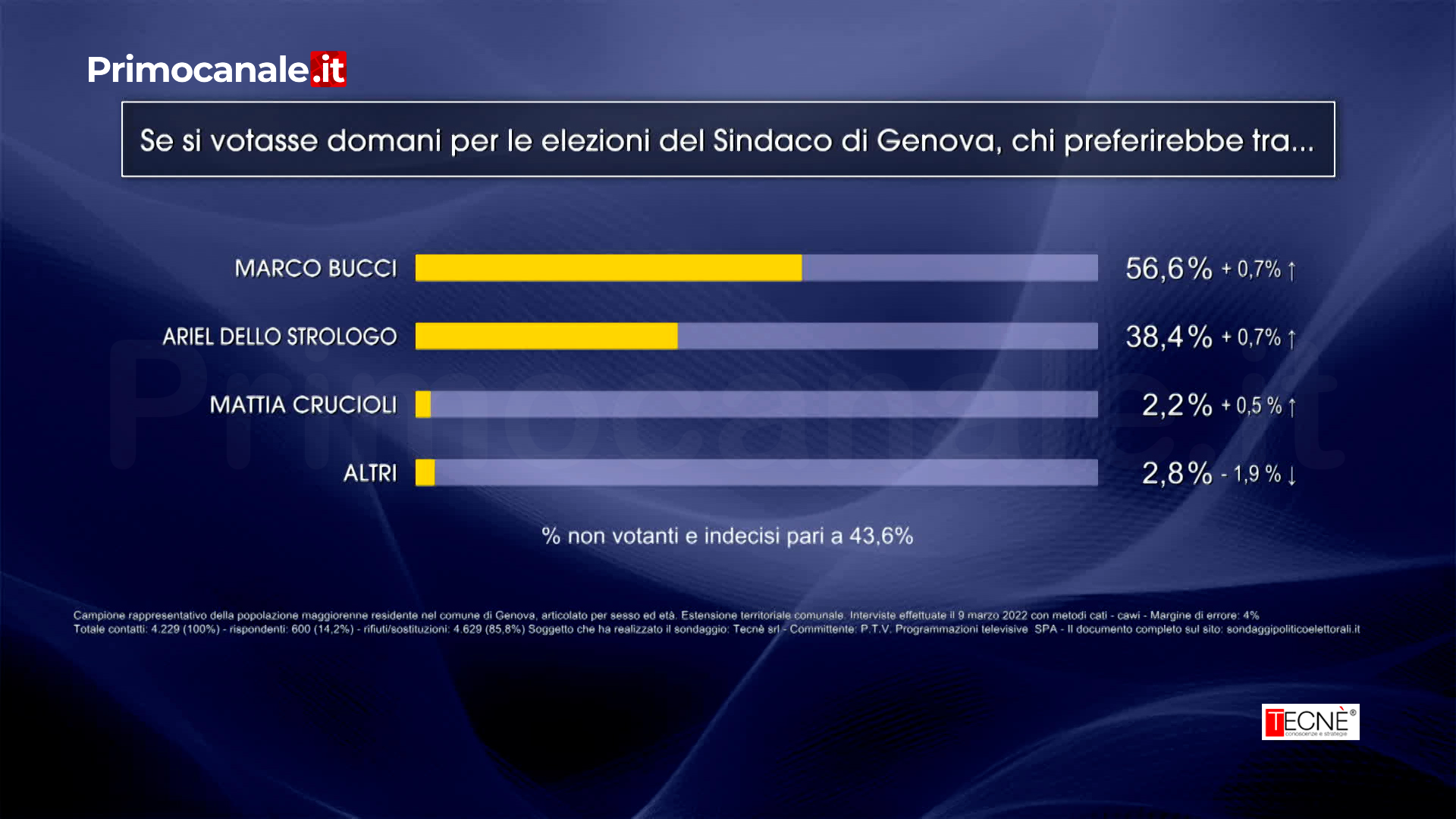 GENOVA - Marco Bucci e Ariel Dello Strologo crescono a braccetto ma con 18 punti percentuali a vantaggio del sindaco uscente. La domanda del sondaggio Primocanale/Tecné riproposta a due settimana dal precedente sondaggio su chi voterebbe oggi come sindaco il 56,6% risponde l'attuale sindaco Bucci con un incremento del +0,7% rispetto a due settimane fa.