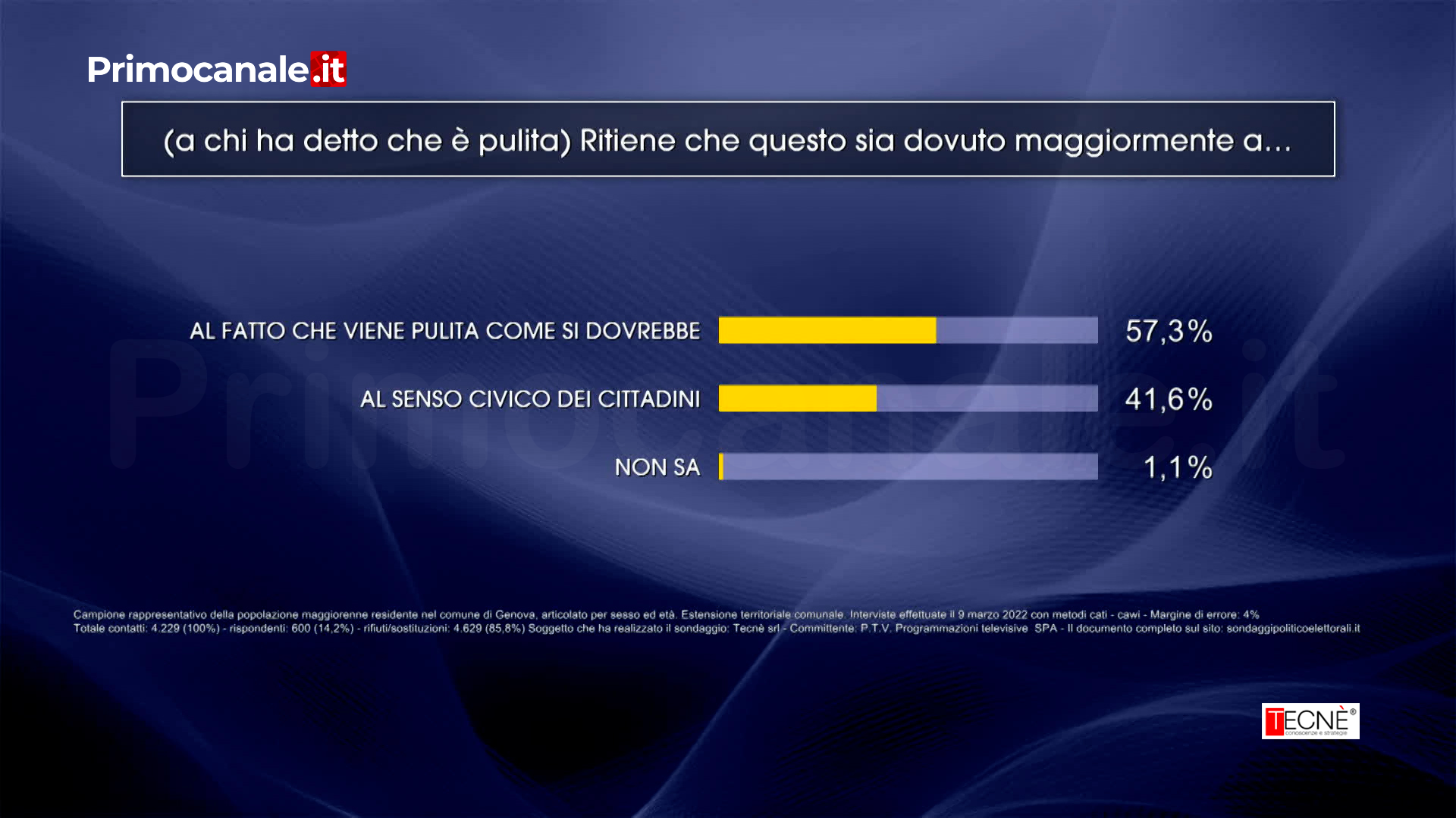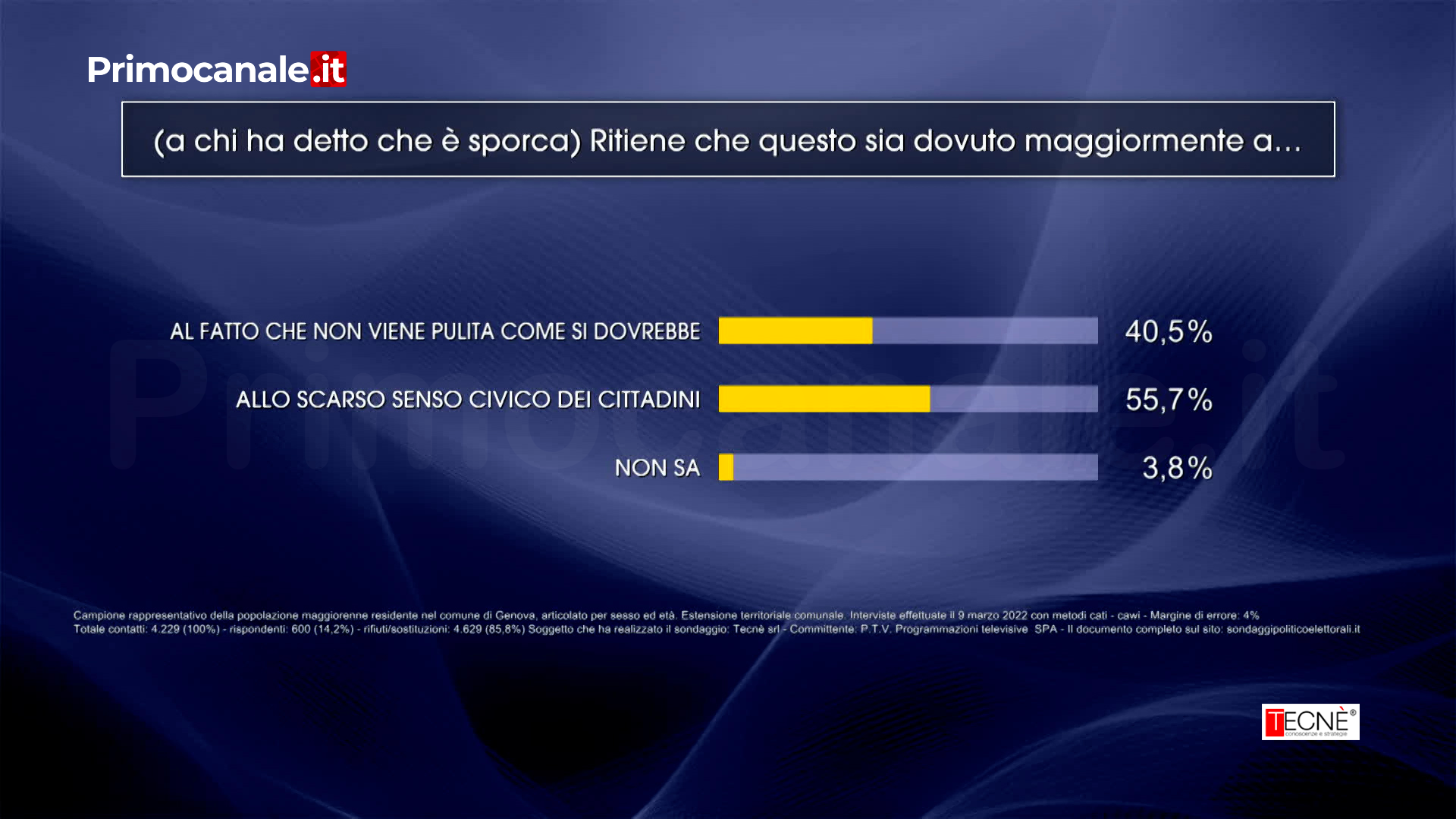 Analizzando le risposte date dai genovesi intervistati emerge che chi ritiene che la città sia sporca attribuisce la colpa allo scarso senso civico dei cittadini (55,7%) mentre per il 40,5% al fatto che non viene pulita come si dovrebbe. Il 3,8% invece non sa dare una risposta del perché giudica la città sporca.