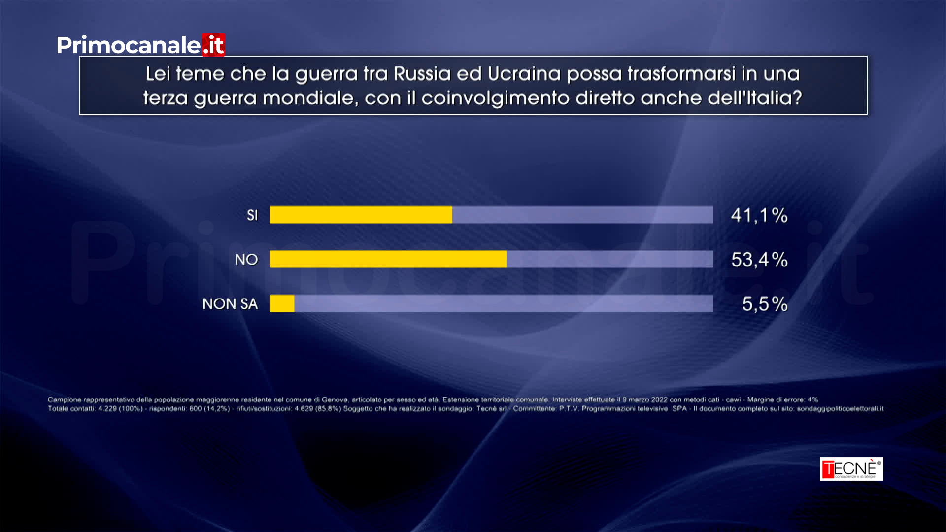 Infine fotografia sullo scenario geopolitico che sta tenendo alta l'attenzione del mondo su quello che sta accadendo in Ucraina. Per la maggioranza degli intervistati però l'attuale guerra tra Russia e Ucraina non rischia di far scaturire la terza guerra mondiale con il coinvolgimento diretto dell'Italia (53,4%) mentre per il 41,1% il rischio di un conflitto globale che vedrebbe la partecipazione dell'Italia c'è. Infine il 5,5% non si esprime.