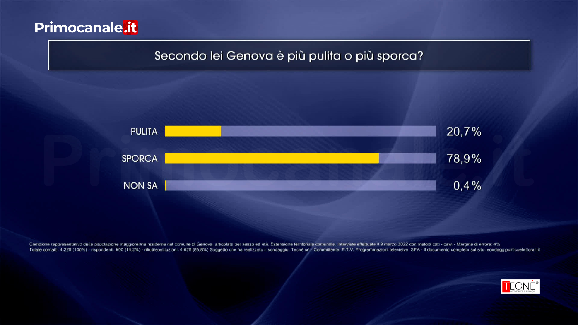 La città è sporca. Così almeno la pensano i genovesi. Il sondaggio Tecné/Primocanale evidenzia che per il 78,9% degli intervistati la città è sporca. Il 20,7% invece considera che negli ultimi anni Genova risulta pulita.