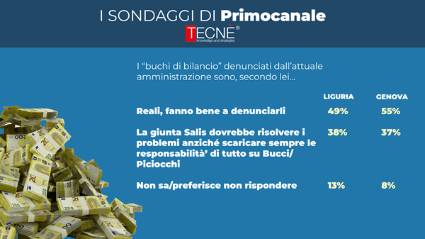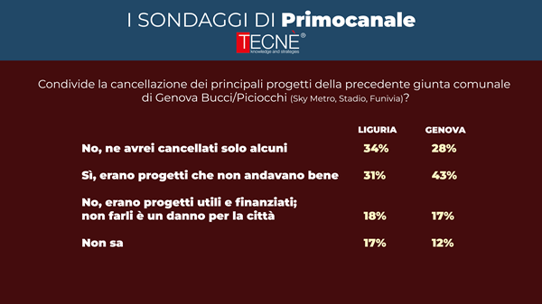Campione probabilistico di 1.200 casi, rappresentativo della popolazione maggiorenne residente in Liguria, stratificato per provincia, con un sovracampionamento di 569 casi nel comune di Genova per un totale di 1.000 casi di età pari o superiore ai 18 anni residenti nel capoluogo. Totale interviste: 1.769. Variabili di controllo: sesso, età, istruzione, professione - Estensione territoriale: territorio regionale. Interviste effettuate tra il 29 agosto e il 3 settembre 2025 con metodo cati - cawi. Totale contatti: 11.789 (100,0%); rispondenti 1.769 (15,0%); rifiuto e sostituzioni: 10.020 (85,0%). Margine di errore: + -2,8% per i dati che riguardano la regione Liguria; + -3,1% per i dati che riguardano il comune di Genova.