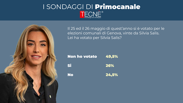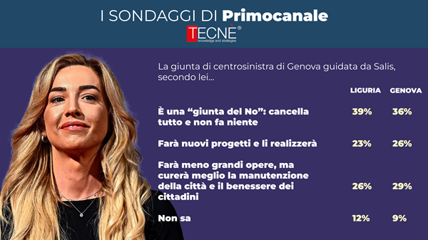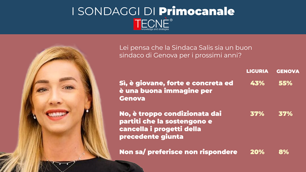 Dopo la pausa estiva tornano i sondaggi di Primocanale in collaborazione con l'istituto di ricerca Tecnè. In occasione dei primi cento giorni di Silvia Salis alla guida dell'amministrazione comunale della città, abbiamo voluto testare il suo indice di gradimento. I numeri "parlano" di una luna di miele tra la sindaca e i genovesi e, addirittura, vedono alzarsi del 4.2% il suo indice di gradimento rispetto alle votazioni del 25-26 maggio su tutti gli elettori.